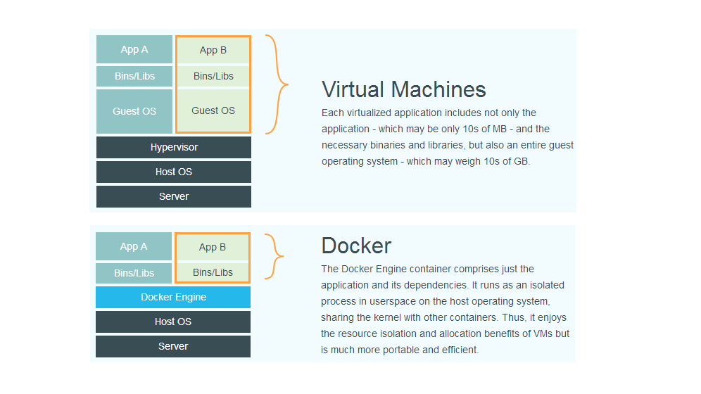 Docker 借鉴了标准集装箱的概念。 标准集装箱将货物运往世界各地,Docker 将这个模型运用到自己的设计中。唯一不同的是:集装箱运输货物,而 Docker 运输软件。 和集装箱一样,Docker 在执行上述操作时,并不关心容器中到底装了什么, 它不管是 web 服务器,还是数据库,或者是应用程序服务器什么的。所有的容器都按照相同的方式将内容“装载”进去。Docker 也不关心你要把容器运到何方, 我们可以在自己的笔记本中构建容器,上传到 Registry ,然后下载到一个物理的或者虚拟的服务器来测试,在把容器部署到具体的主机中。像标准集装箱一样,Docker 容器方便替换,可以叠加,易于分发,并且尽量通用。