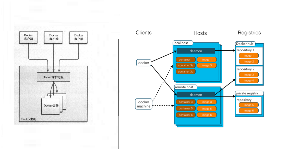 Docker 是一个客户端-服务器(C/S)架构程序。Docker 客户端 只需要向 Docker 服务器或者守护进程 发出请求,服务器或者守护进程将完成所有工作并返回结果。Docker 提供了一个命令行工具以及一整套RESTful API,你可以在同一台宿主机上运行 Docker 守护进程和客户端,也可以从本地的 Docker 客户端连接到运行在另一台宿主机上的远程 Docker 守护进程。