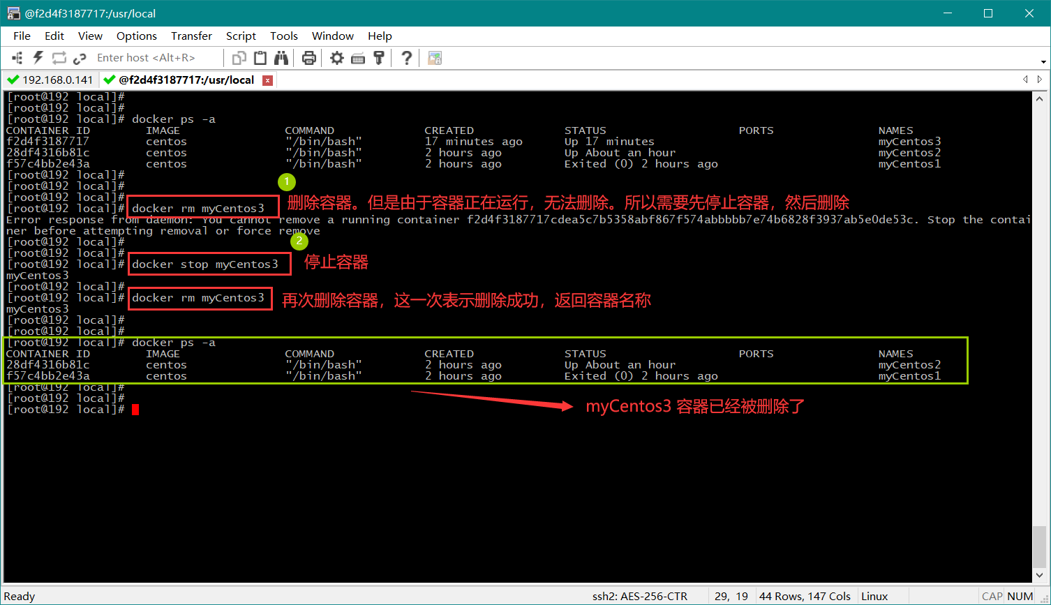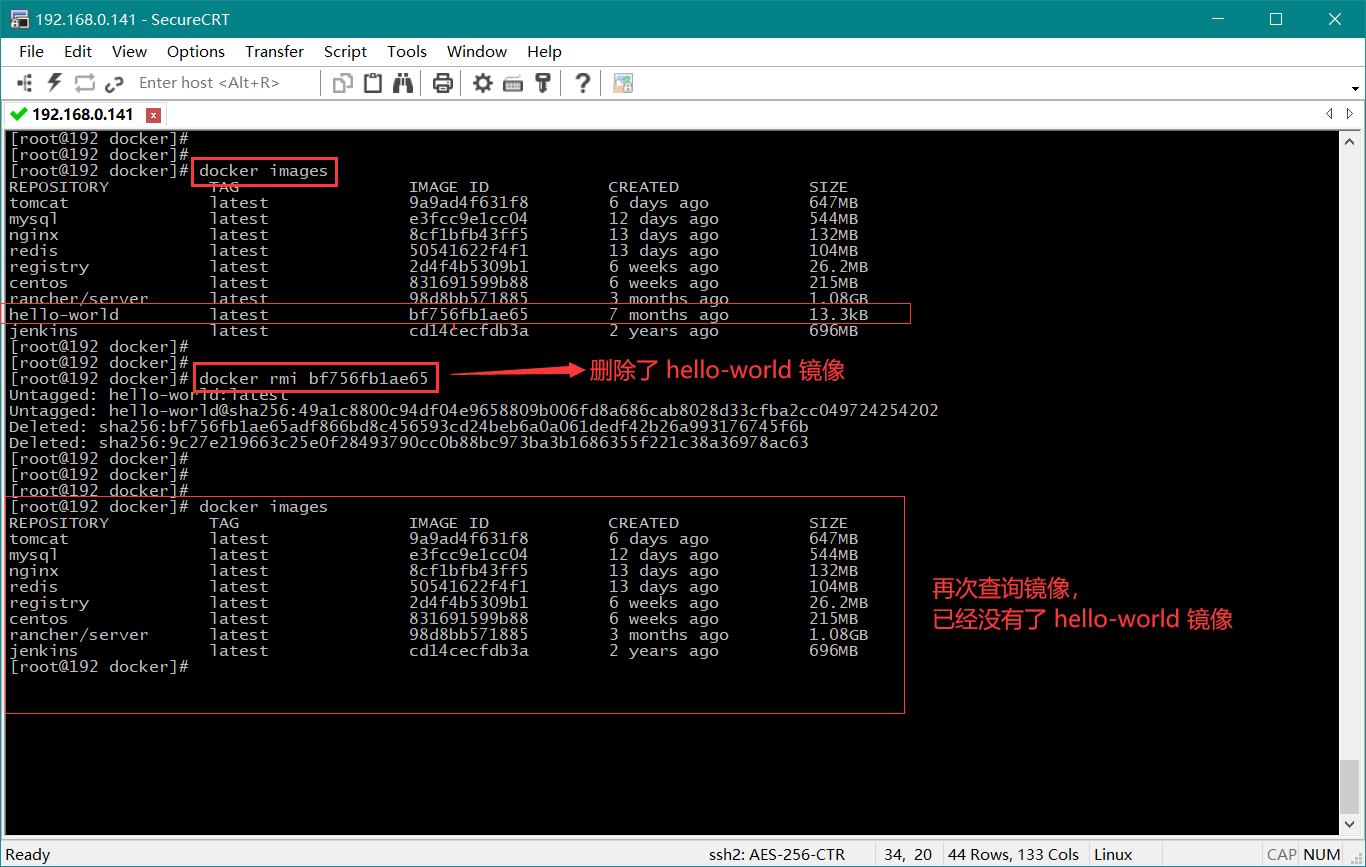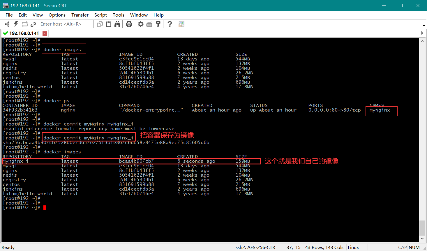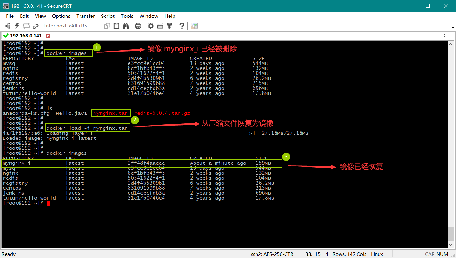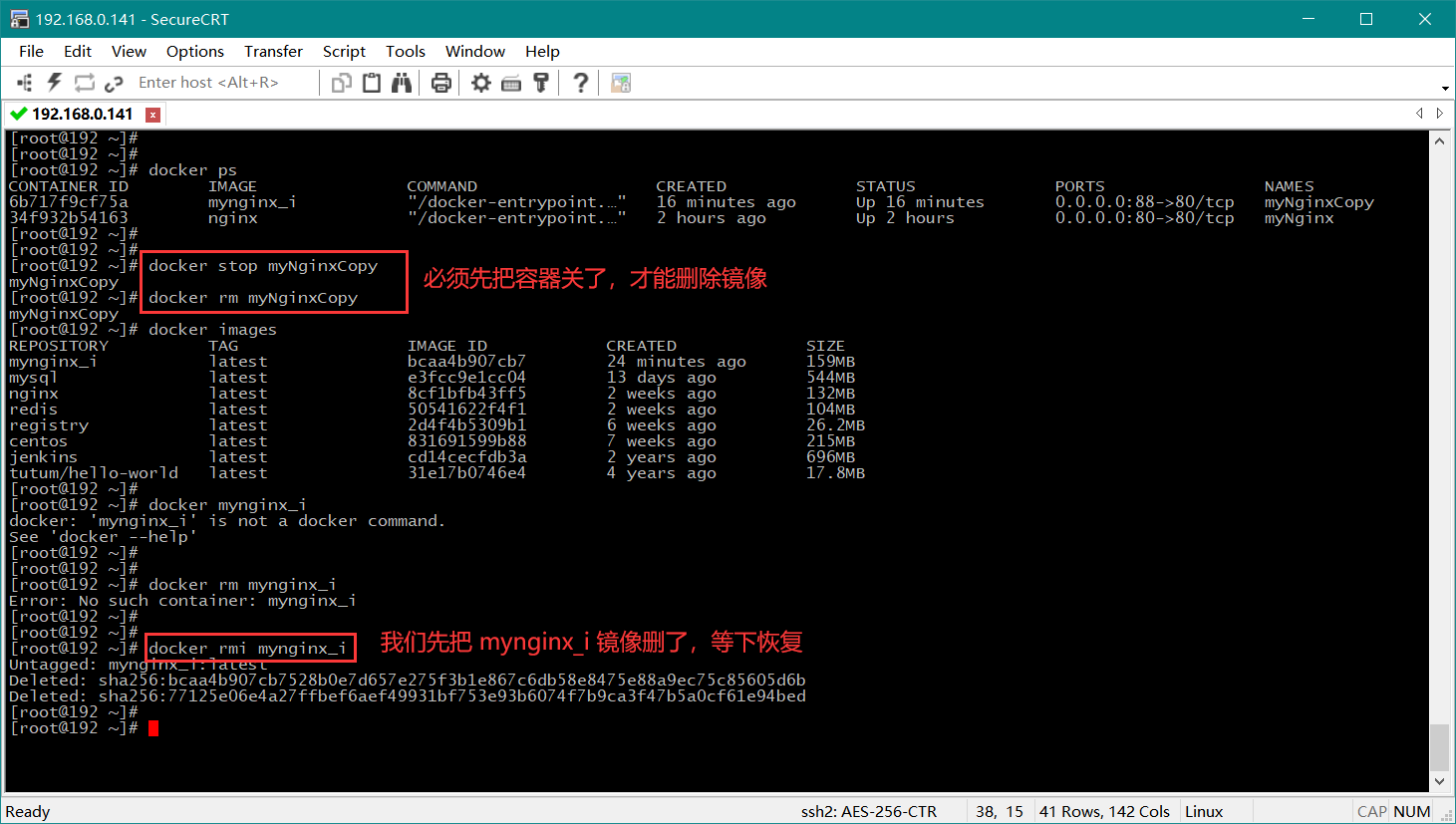 首先,我们先删除掉 mynginx_i 镜像,然后执行相关命令进行恢复。操作如下图: