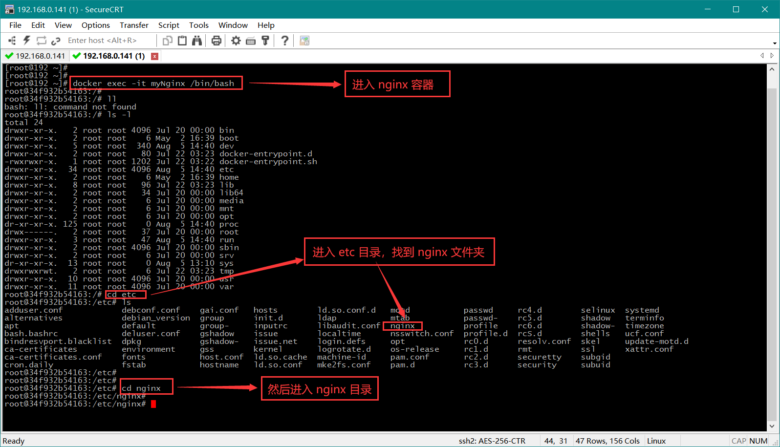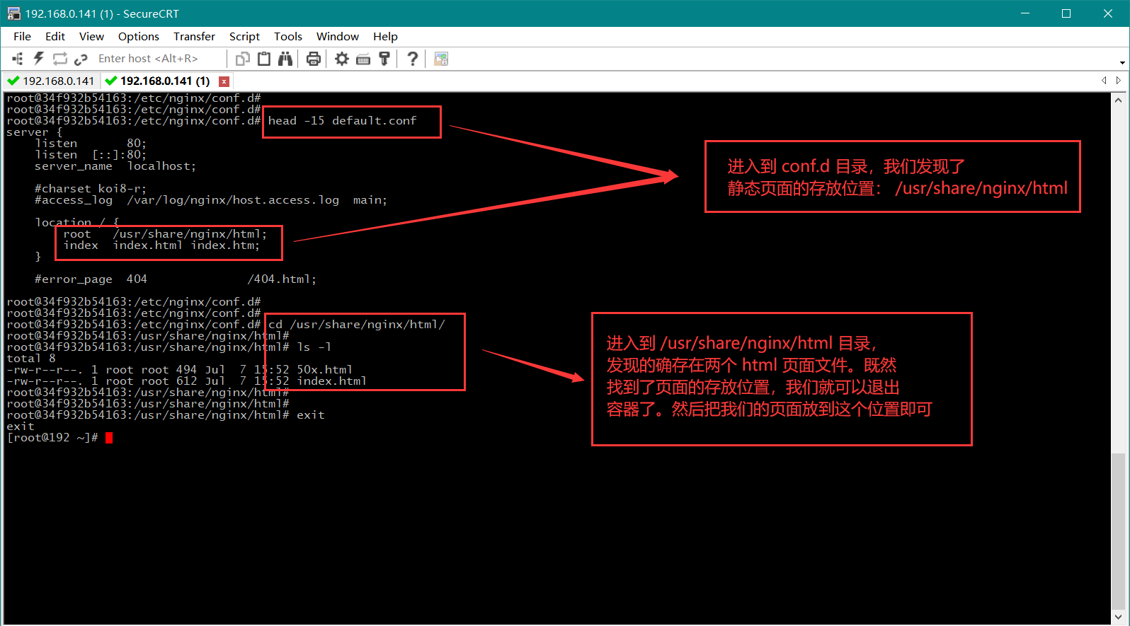 第二步: 进入到 nginx 容器,获取到静态页面所在的目录。 具体操作如下图: