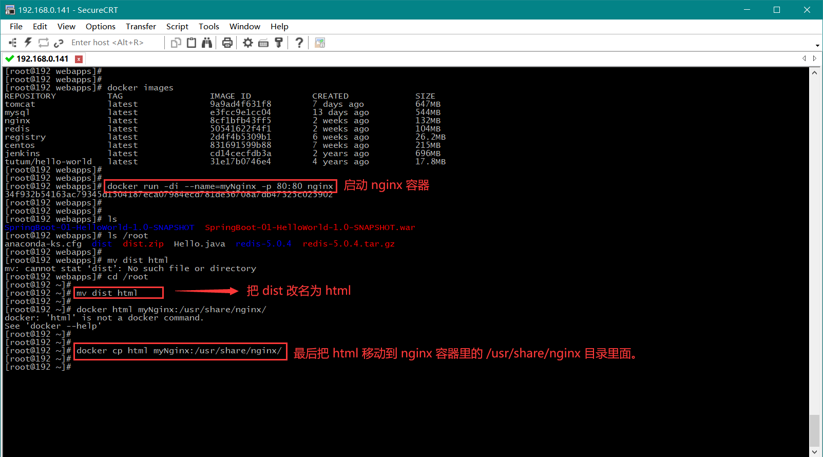 第三步: 解压 dist 压缩包,并改名为 html 【解压我自己提前做了】。然后把 html 复制到 nginx 容器中, 如下图:
