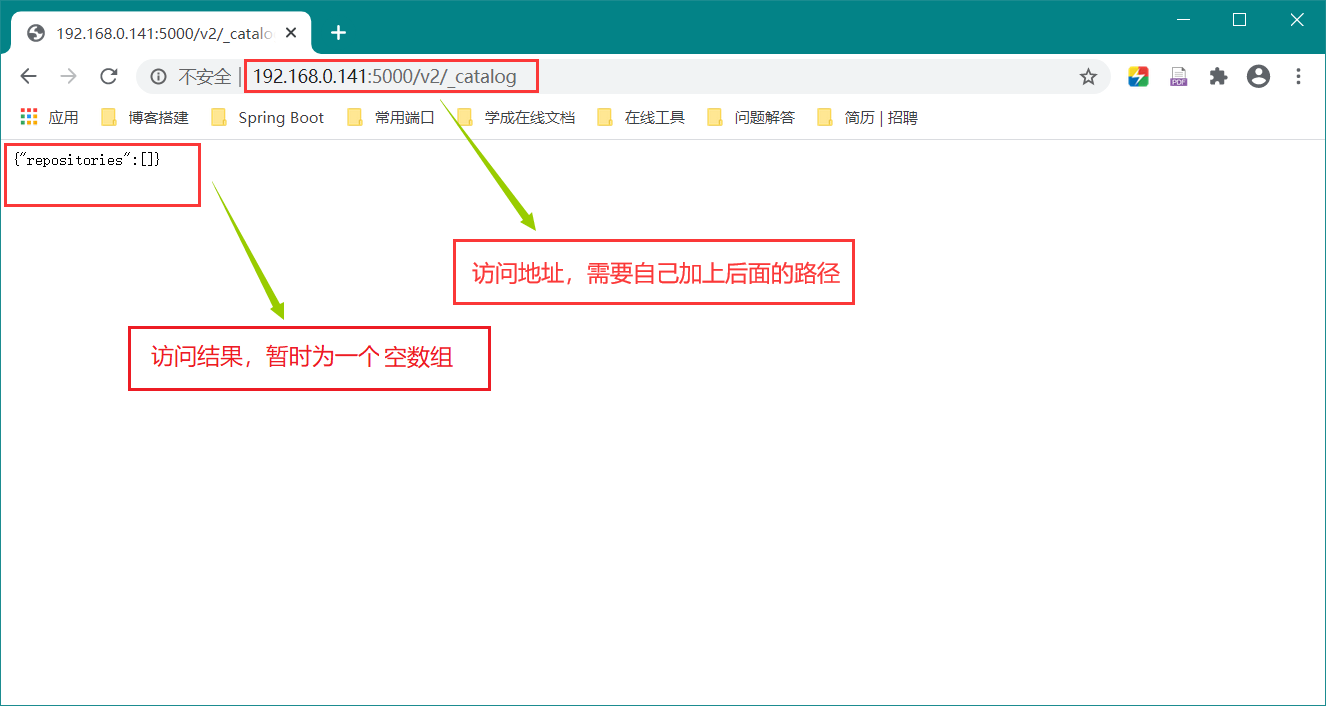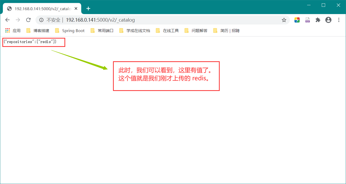 如果能够访问到上述页面,则代表私有仓库搭建成功。 至于页面内容返回值为空数组,那是因为这个私有仓库刚刚搭建,它里面还没有 docker 镜像。那么接下来的操作就是把我们的 docker 镜像上传到我们的私有仓库。 操作步骤如下: