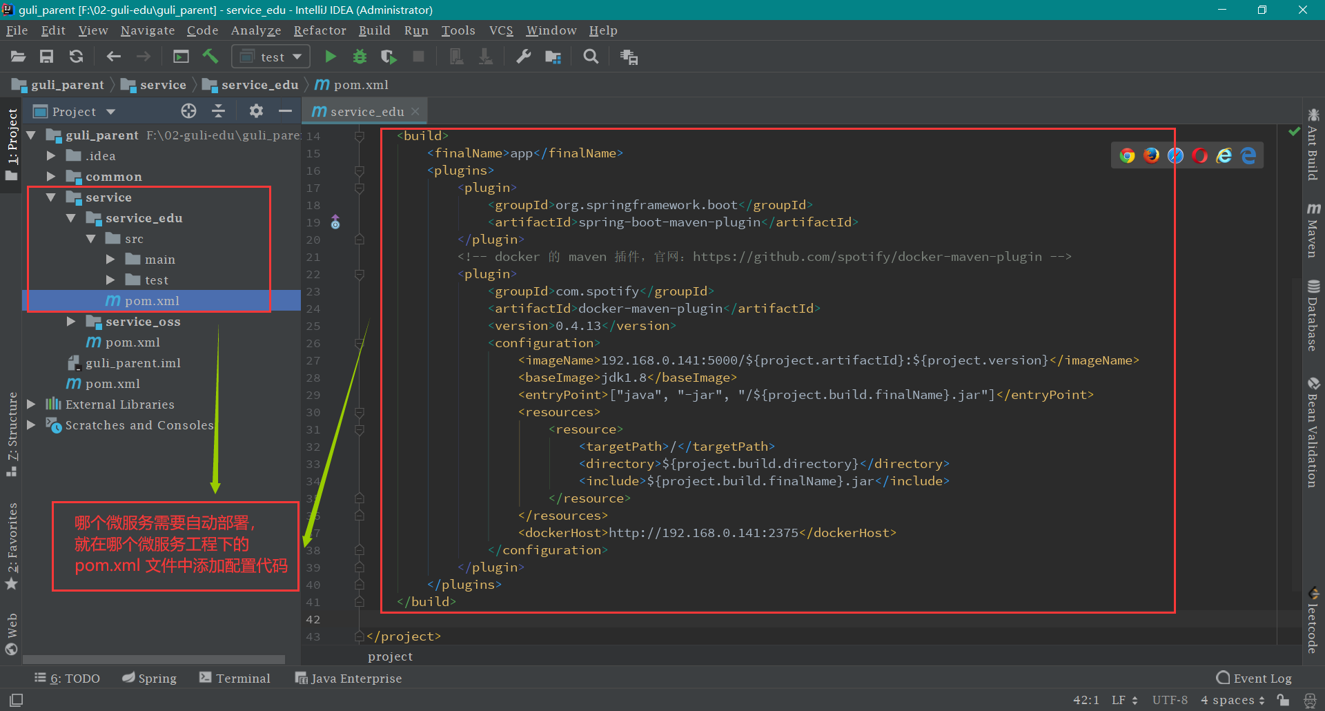 对于数量众多的微服务,手动部署无疑是非常麻烦的做法,并且容易出错。 所以我们这里学习如何自动部署,这也是企业实际开发中经常使用的方法。那么接下来,我们就通过 Maven 插件来实现自动部署。 其具体步骤如下: