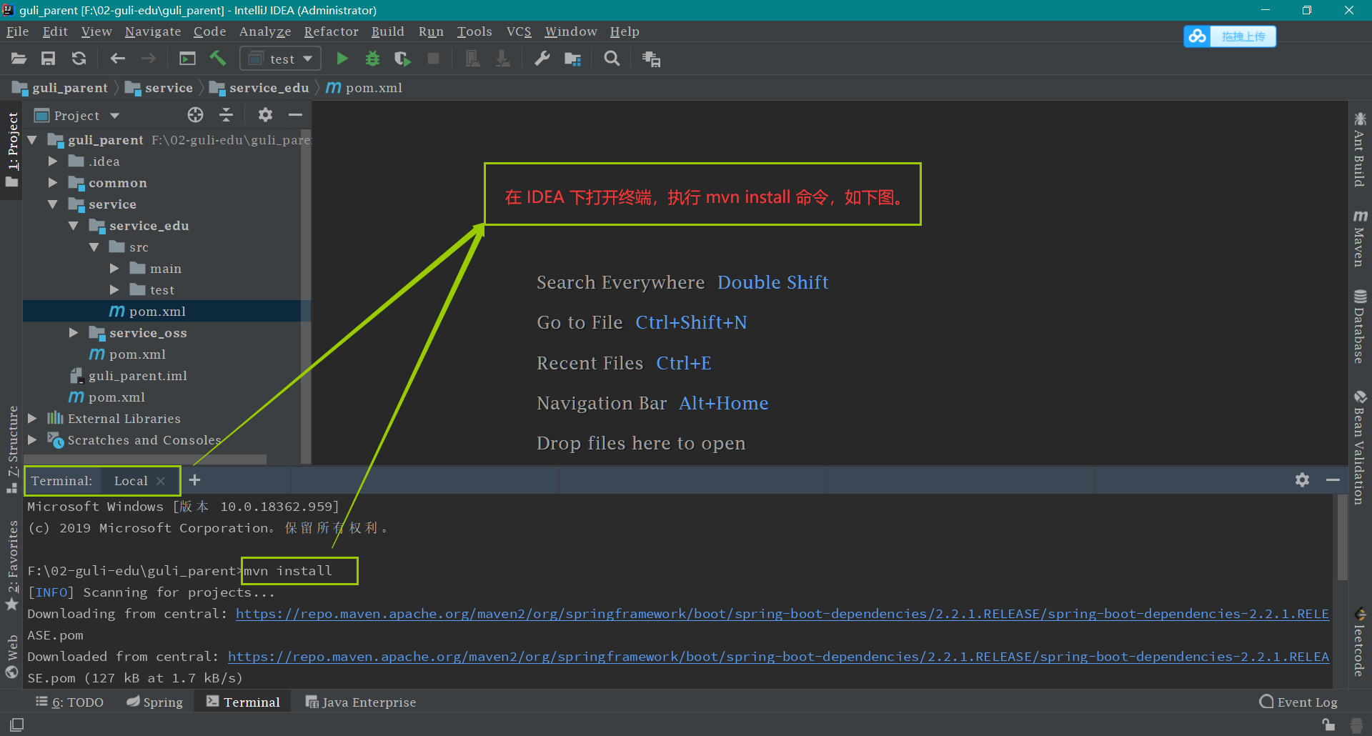 第五步: 使用 IDEA 打开微服务项目,然后在 IDEA 下打开终端,执行 mvn install 命令。 如下图: