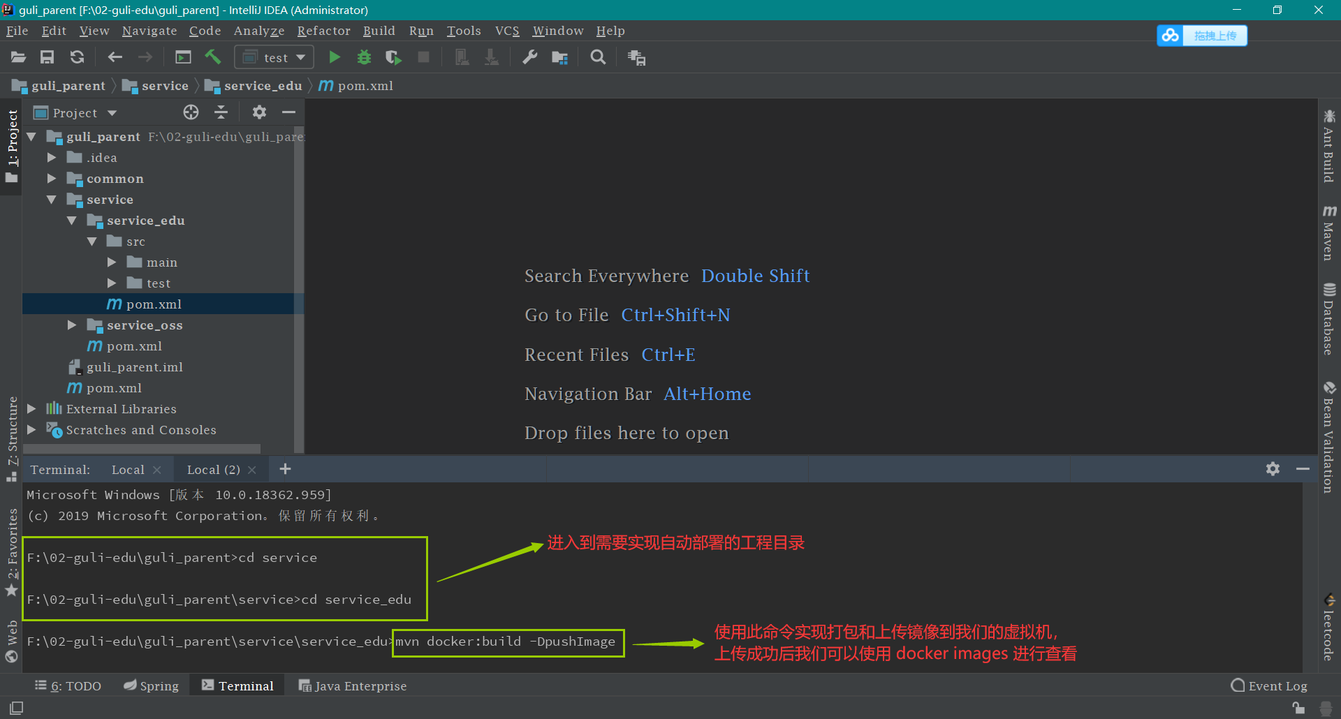 当上述操作完成后,我们进入到 第六步: 进入到需要实现自动部署的微服务工程目录下,输入命令 mvn docker:build -DpushImage 进行打包和上传镜像。 具体操作与详情请参照下图: