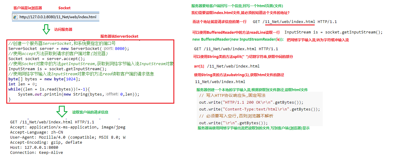 1 2 3 4 5 6 7 8 9 10 11 12 13 14 15 16 17 18 19 20 21 public static void main (String[] args) throws IOException { System.out.println("服务端启动 , 等待连接 .... " ); ServerSocket server = new ServerSocket(6666 ); Socket socket = server.accept(); InputStream is = socket.getInputStream(); byte [] bytes = new byte [1024 ]; int len = is.read(bytes); String msg = new String(bytes, 0 , len); System.out.println(msg); is.close(); server.close(); }