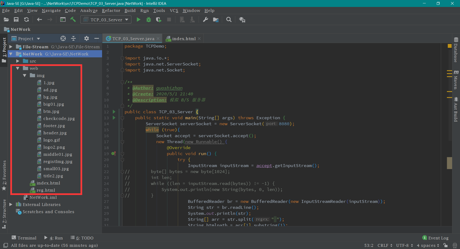 2、服务端:java.net.ServerSocket 类表示。创建 ServerSocket 对象,相当于开启一个服务,并等待客户端的连接。