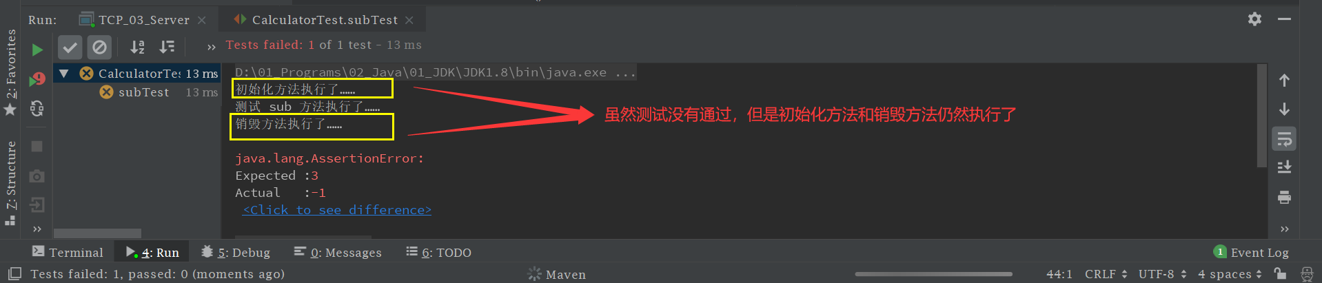 CalculatorTest.java 1 2 3 4 5 6 7 8 9 10 11 12 13 14 15 16 17 18 19 20 21 22 23 24 25 26 27 28 29 30 31 32 33 34 35 36 37 38 39 40 41 42 43 44 45 46 47 48 49 50 51 52 53 54 55 56 57 58 package JunitTest;import org.junit.After;import org.junit.Assert;import org.junit.Before;import org.junit.Test;public class CalculatorTest { @Before public void init () { Calculator calculator = new Calculator(); System.out.println("初始化方法执行了……" ); } @Test public void addTest () { Calculator calculator = new Calculator(); int result = calculator.add(1 , 2 ); Assert.assertEquals(3 , result); } @Test public void subTest () { Calculator calculator = new Calculator(); int result = calculator.sub(1 , 2 ); System.out.println("测试 sub 方法执行了……" ); Assert.assertEquals(3 , result); } @After public void destory () { System.out.println("销毁方法执行了……" ); } }