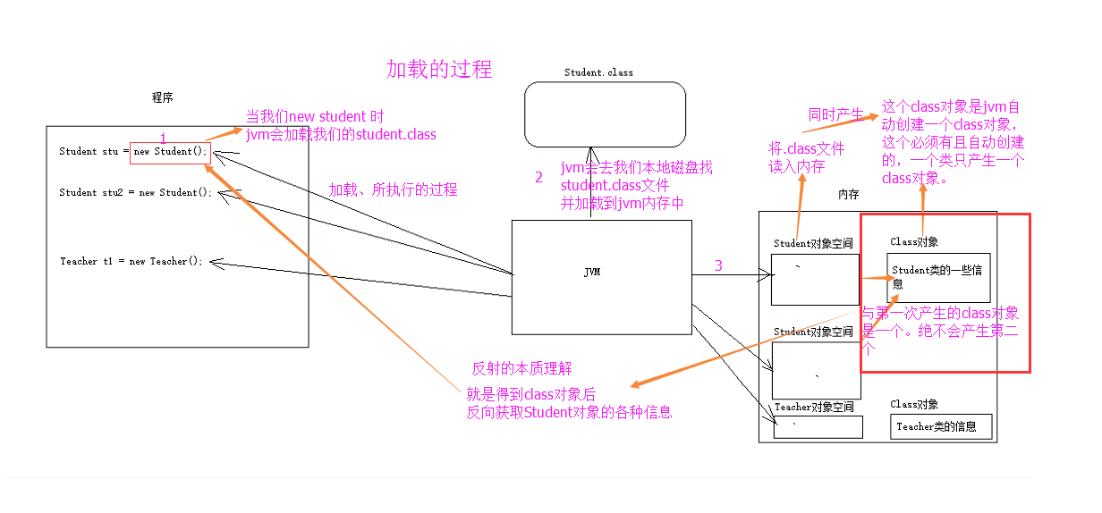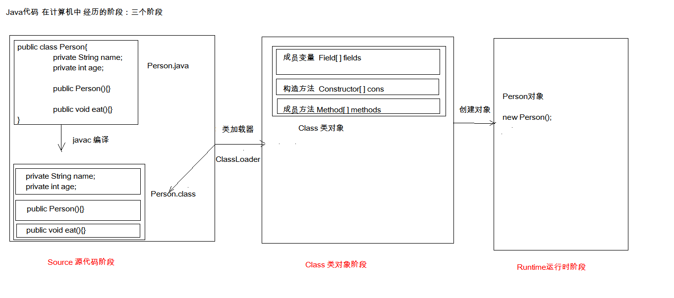 反射相关知识 反射: 是将类的各个组成部分封装为其他对象,这就是反射机制。 但使用反射的 前提条件 是: 必须先得到字节码的 Class ,Class 类用于表示 .class 文件【即我们常说的字节码文件】。 下图是我们 Java 代码的三个阶段: