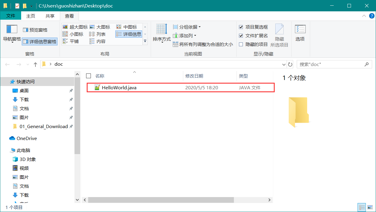 创建一个文件夹 随便在桌面上建立一个文件夹【我的叫 doc】, 里面放一个 HelloWorld.java 文件。如下图: