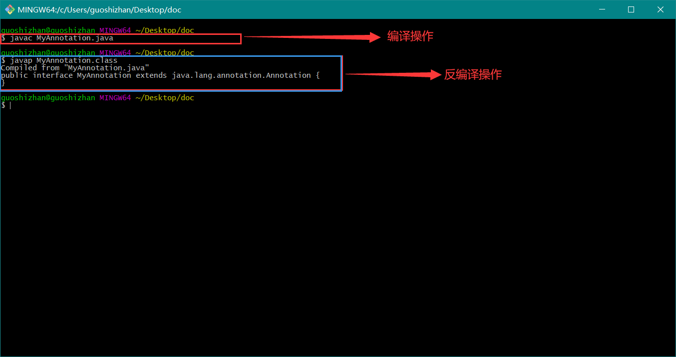 通过反编译的结果 public interface MyAnno extends java.lang.annotation.Annotation {} 可知,注解本质上就是一个接口,该接口默认继承 Annotation 接口 。 既然是我们熟悉的接口,那就更好理解一点了。