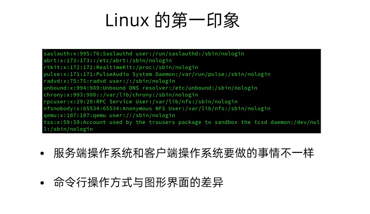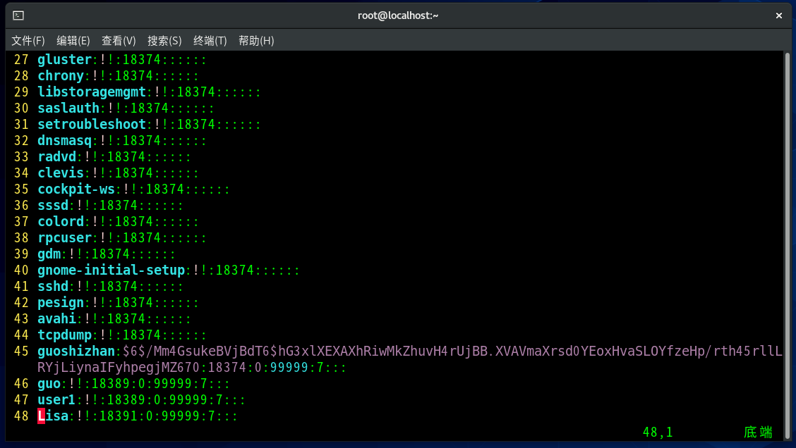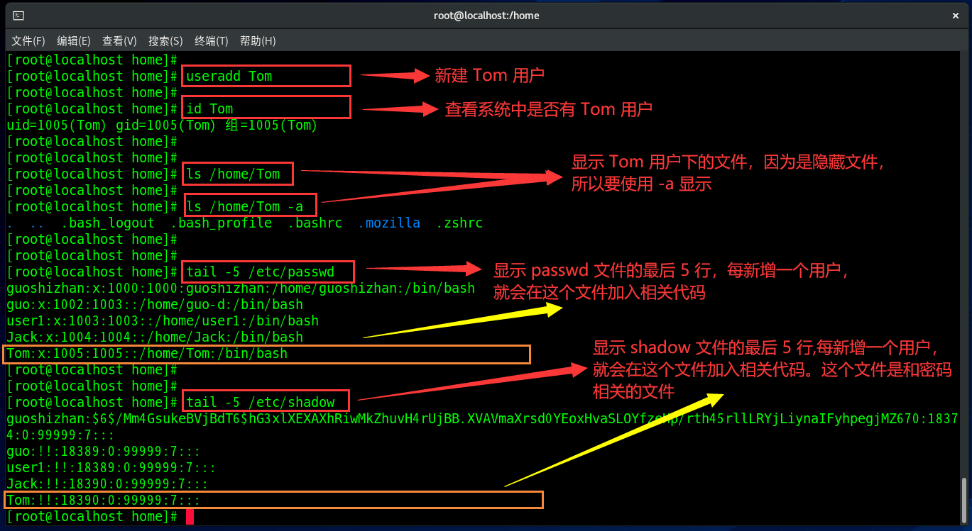 新建一个用户之后,Linux 系统会做哪些事情呢?首先: 会给用户分配一个家目录,位置在 /home/用户名 。第二: 用户还会被记录到 etc/passwd 文件当中,如下图。只要包含 Tom 这一行,就说明有这个用户存在。第三: 用户还会被记录到 /etc/shadow 文件当中,这是与用户密码相关的文件。图片如下: