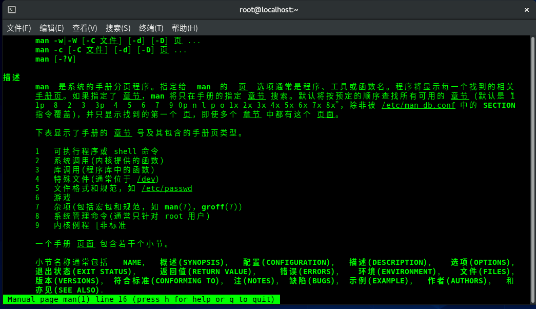 通过上图介绍,我们知道了 man 命令 的相关用法。举个例子,如果我们不知道 ls 命令 怎么用,那么就使用 man ls 来获取 ls 命令的相关介绍。当然了,我们也可以使用 man man 来获取 man 命令的相关帮助。如下图: