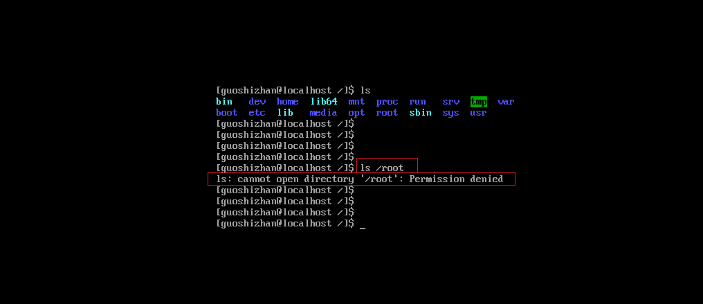 Linux 中文件的颜色代表了是否有权限,有时 ls 命令 会提示权限不足,说明当前的用户还没有权限查看当前的文件。如下图: