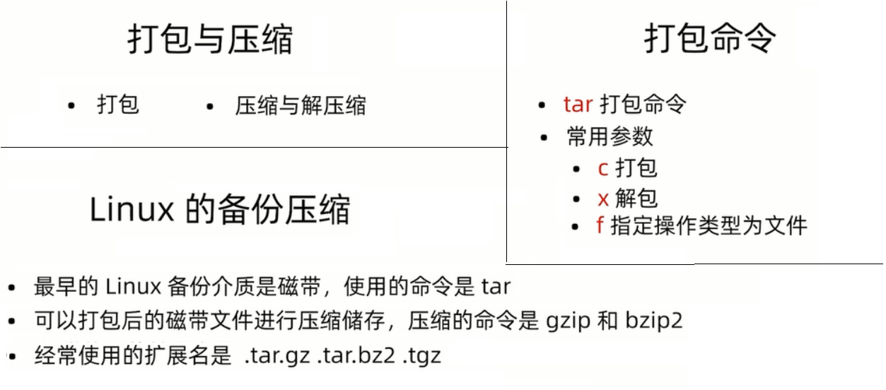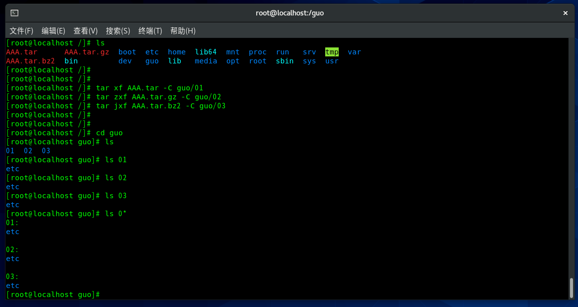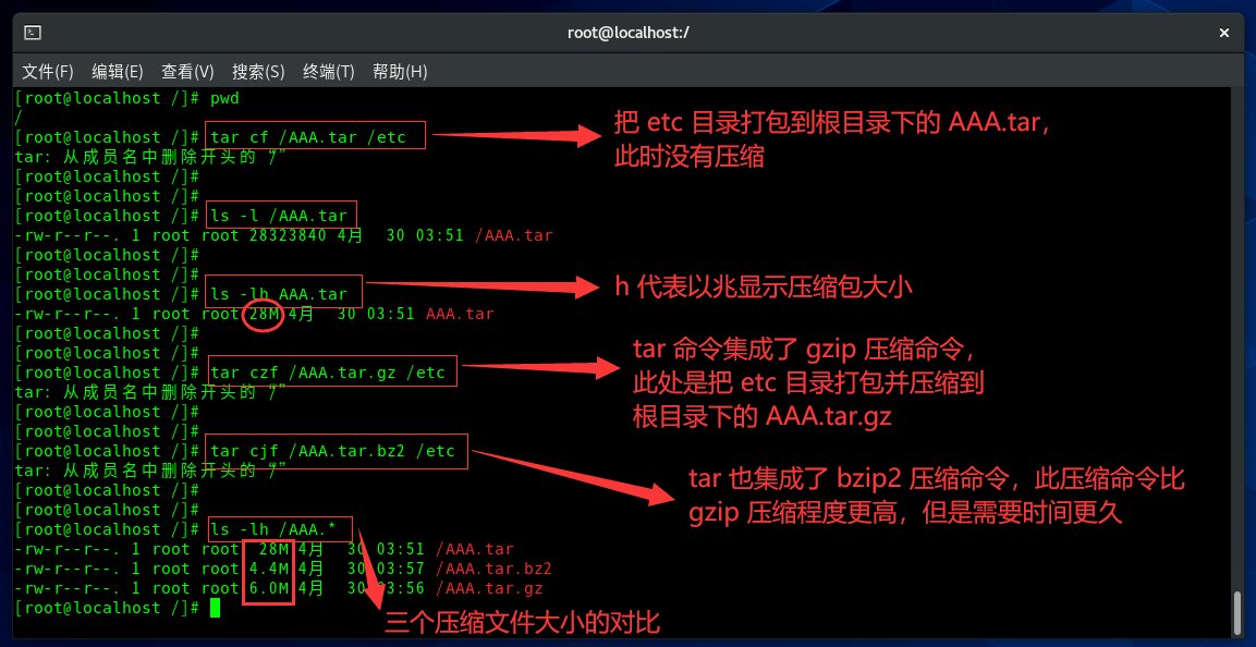 1 | tar cf /AA.tar /etc # tar 命令的选项是没有减号的,选项中的 f 代表打包成文件 |