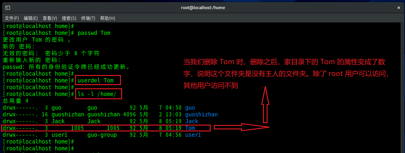 1 | userdel Tom # 删除用户,但是保留了家目录和邮箱命令 |