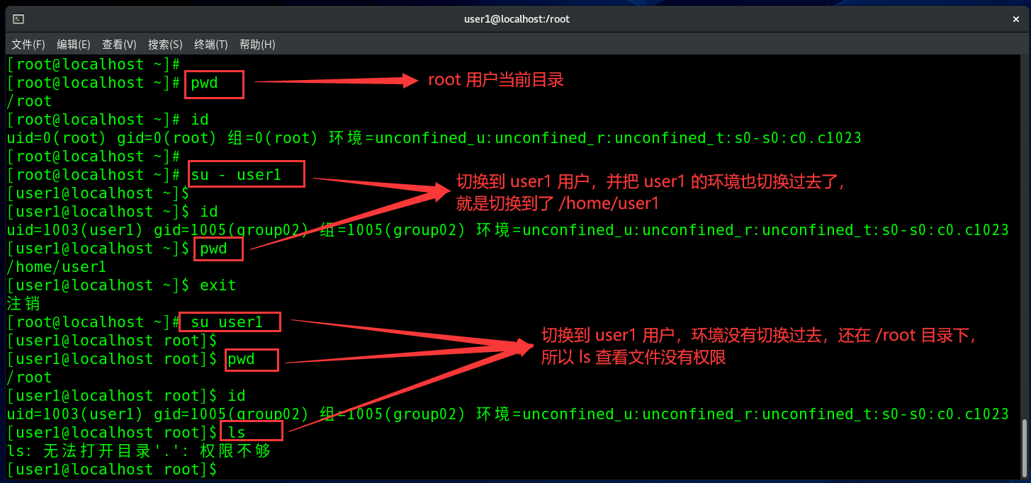 1 | su - user1 # - 的作用就是切换用户的同时,并把当前运行环境变更为 user1 的环境 |