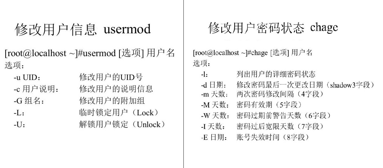 使用 usermod 命令 和 chage 命令 用户信息和用户的生命周期修改以及用户密码相关操作等等进行修改。如下图:
