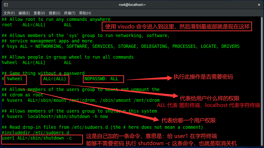 有时候,普通用户想使用命令行关机,但是权限不足,需要切换到 root 用户。这样的话,root 用户的密码就暴露了,普通用户可以拿着密码 干点坏事 。那么如何让普通用户关机且不给 root 密码呢?这么做,如下: