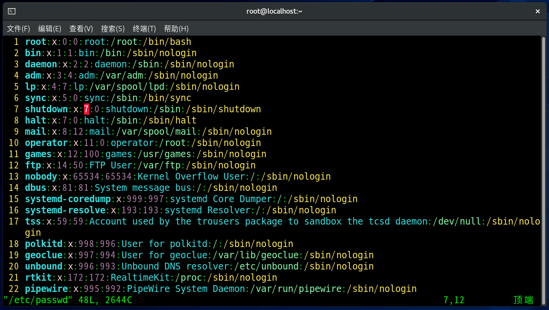 1 | # /etc/passwd 用户的配置文件,分为七个字段 |