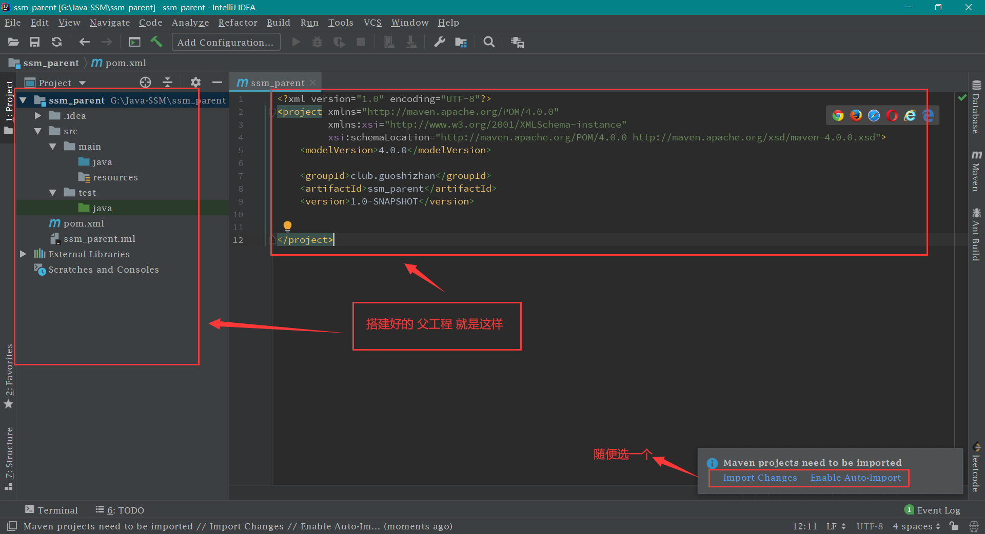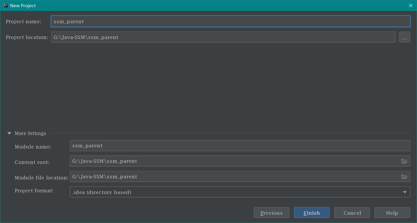 SSM 环境搭建 工程搭建 搭建父工程 首先打开 IDEA , 然后 File -> New -> Project ,接着按下图进行操作即可搭建好父工程。如下图所示: