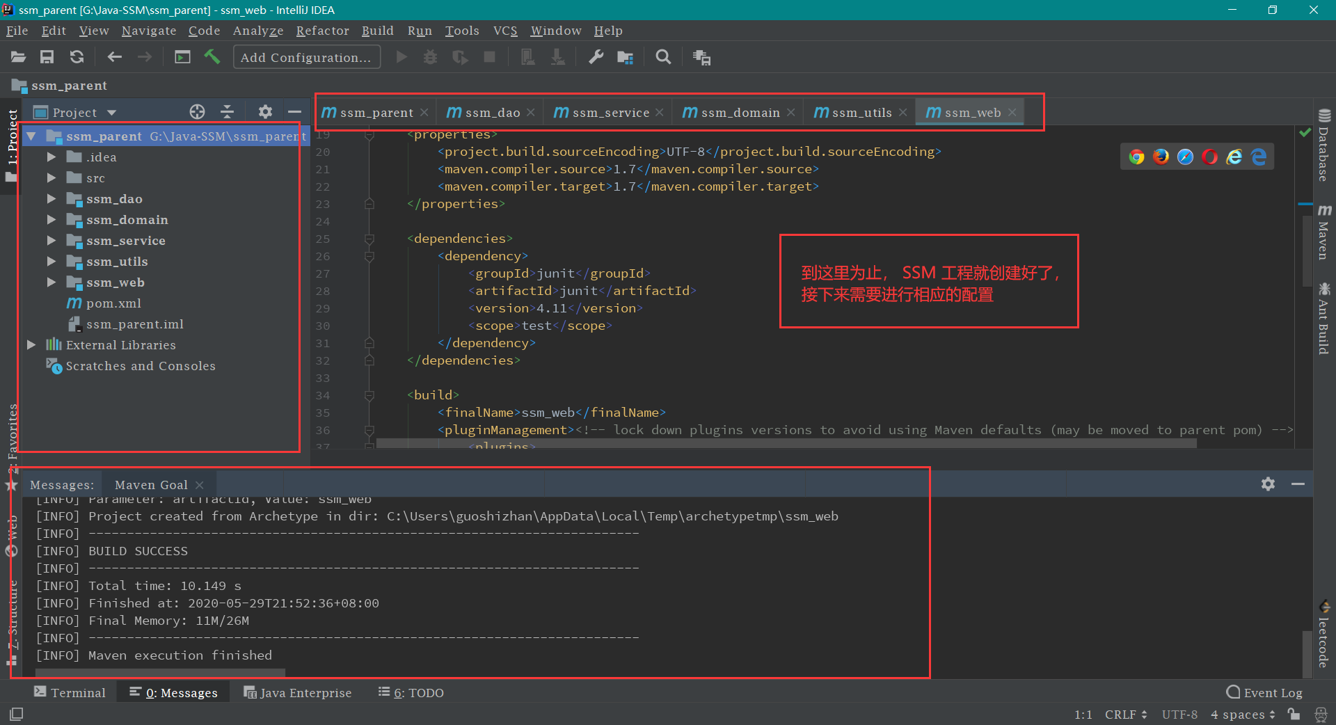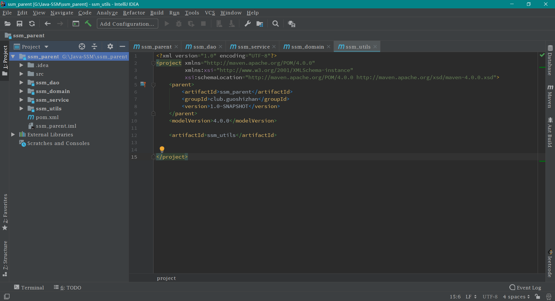 接下来的 ssm_service ,ssm_utils ,ssm_domain 模块的创建和 ssm_dao 的创建方式一模一样,这里就不再一 一赘述了。创建好这些模块之后的工程目录结构如下图。