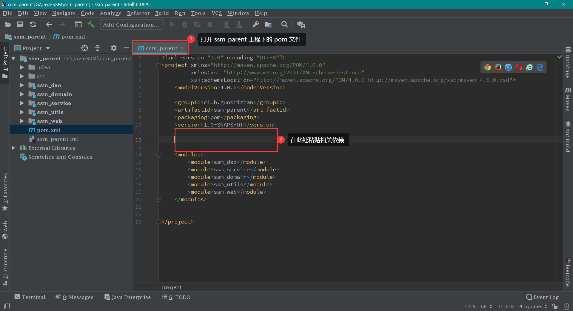 导入依赖 打开 ssm_parent 工程下的 pom.xml 文件,复制如下依赖到下图指定区域: