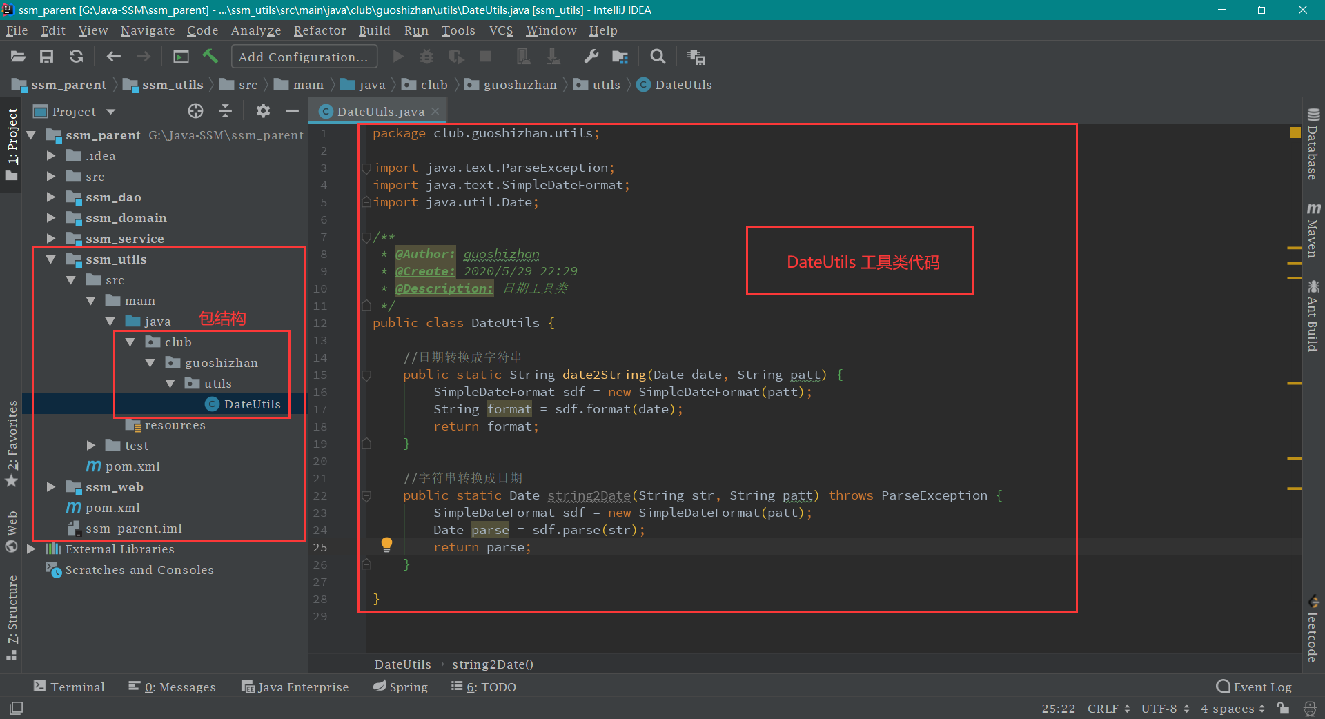 编写工具类 在 ssm_utils -> src -> main -> java 文件下建立一个 utils 包,选择 java ,点击右键,选择 New -> Package ,输入包名为 club.guoshizhan.utils ,然后再在 utils 包下新建 DateUtils 工具类 ,代码内容及截图如下: