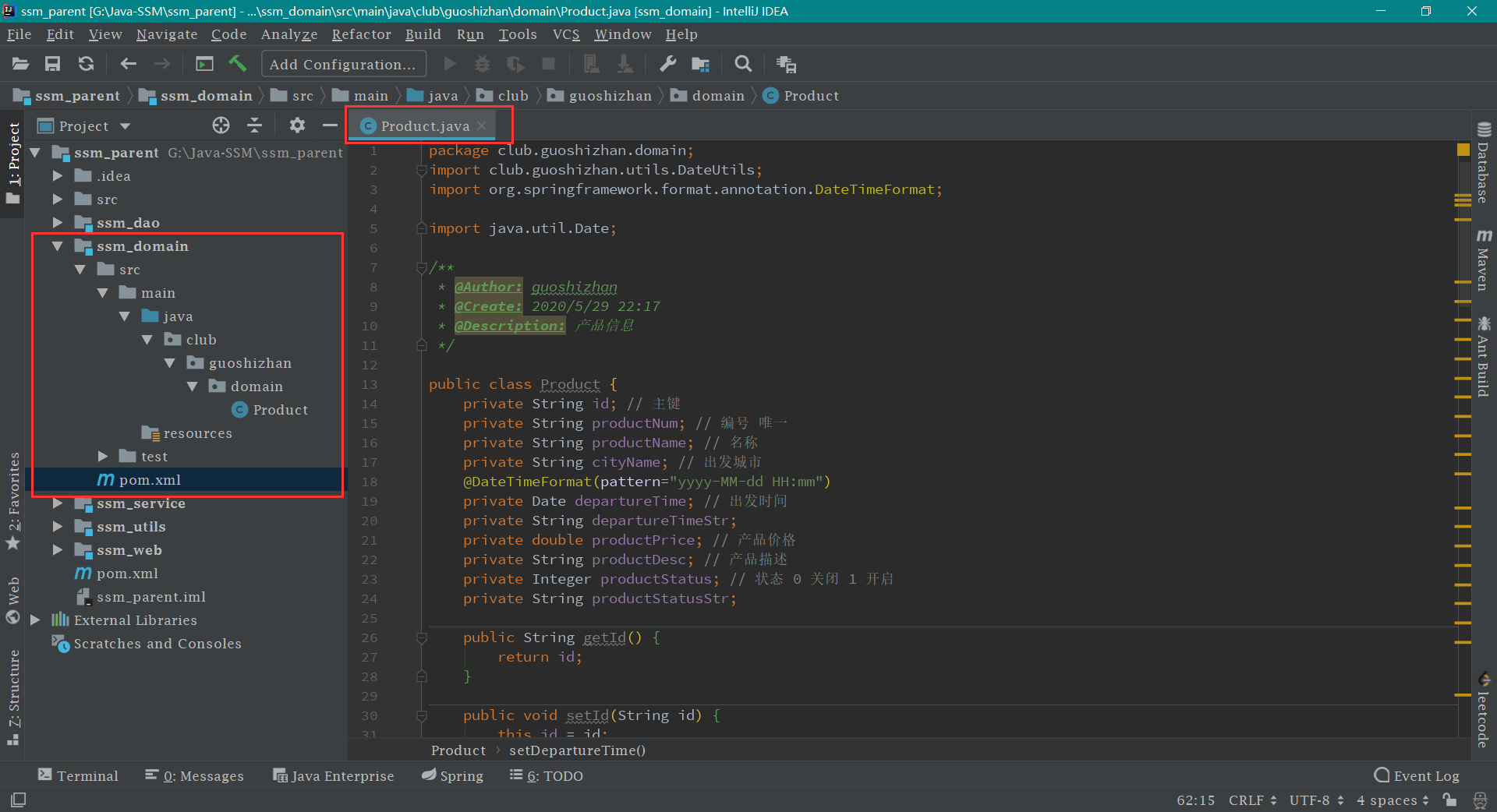 编写实体类 在 ssm_domain -> src -> main -> java 文件下建立一个 domain 包,选择 java ,点击右键,选择 New -> Package ,输入包名为 club.guoshizhan.domain ,然后再在 domain 包下新建 Product 实体类 ,代码内容及见截图如下:
