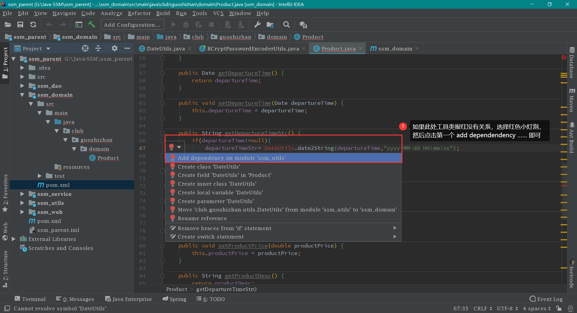 如果遇到 DataUtils 工具类报红 不要慌,按照下图解决即可,如下图: