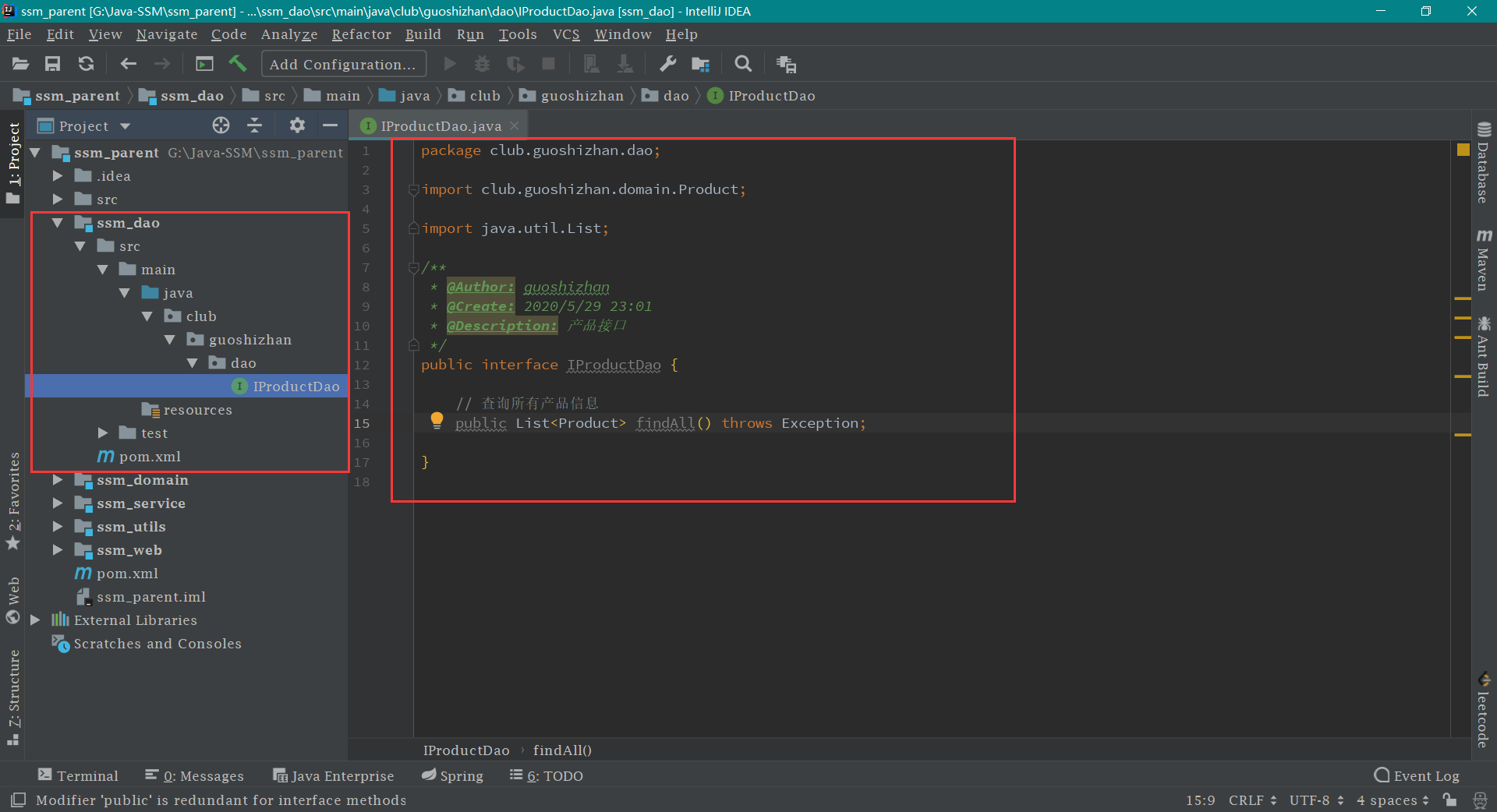 编写 dao 接口 在 ssm_dao -> src -> main -> java 文件下建立一个 dao 包,选择 java ,点击右键,选择 New -> Package ,输入包名为 club.guoshizhan.dao ,然后再在 dao 包下新建 IProductDao 接口 ,代码内容及见截图如下: