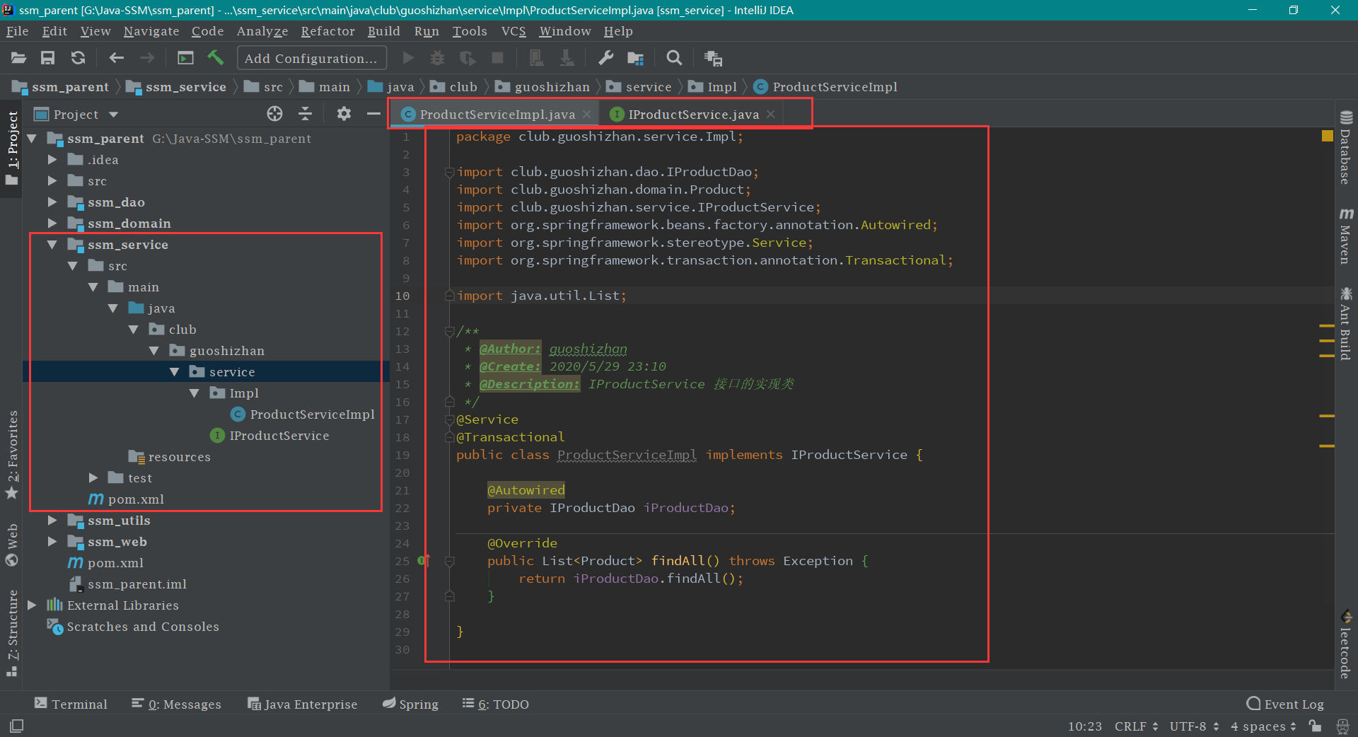 然后再在 service 包下新建 Impl 包,接着在 Impl 包下新建 ProductServiceImpl 类,代码及截图如下: