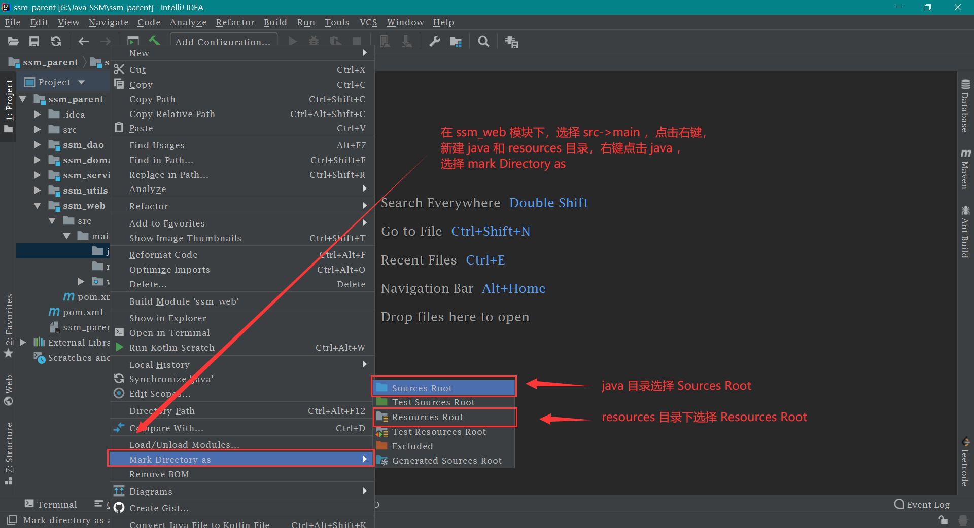 新建目录 在 ssm_web 模块 下,选择 src -> main ,点击右键,选择 New -> Directory 。新建 java 和 resources 两个目录,然后按照下图操作即可。如下: