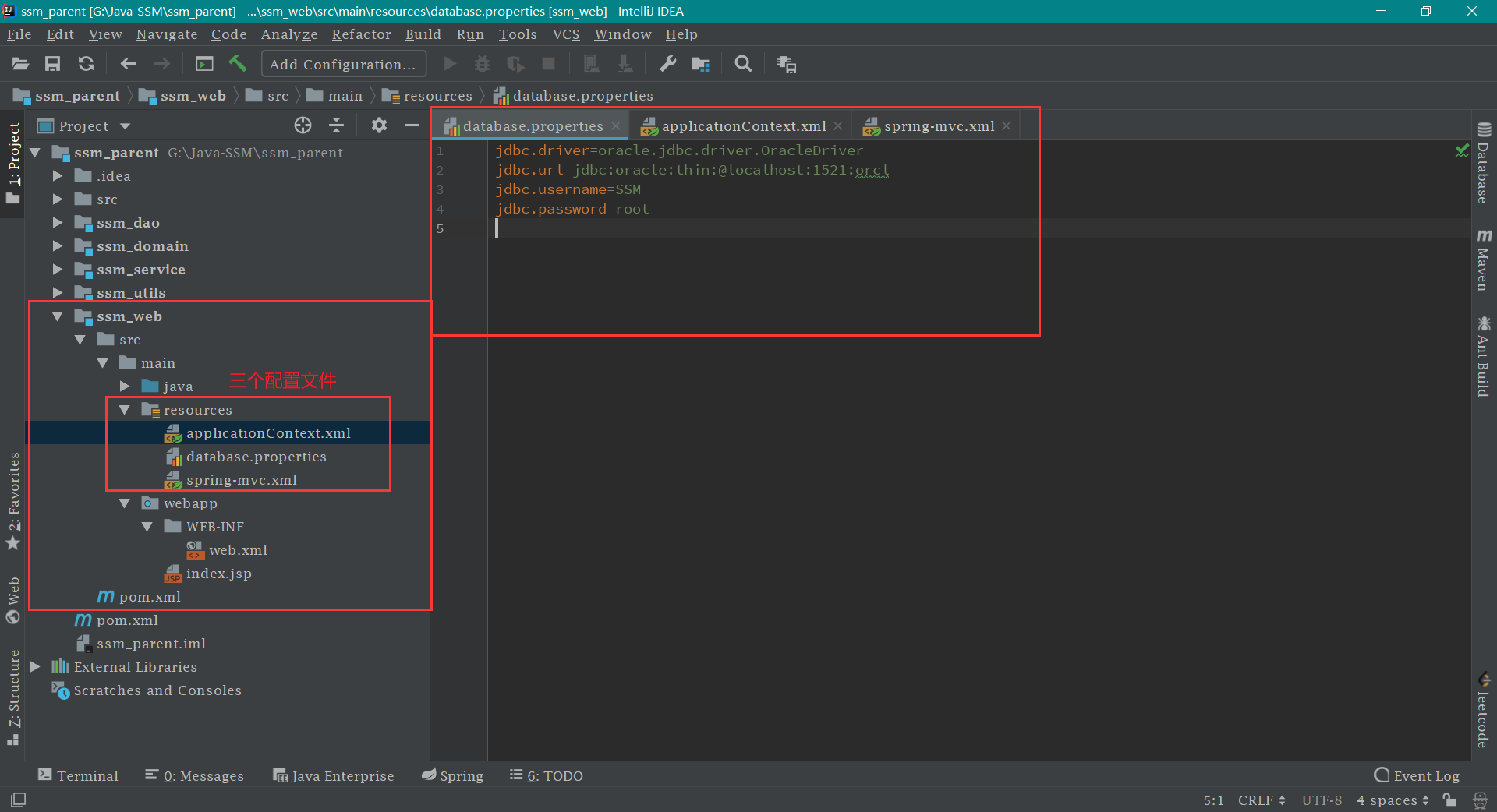 第一步: 在 ssm_web -> src -> main -> resources 下新建 database.properties 文件,并写上相关内容,如下: