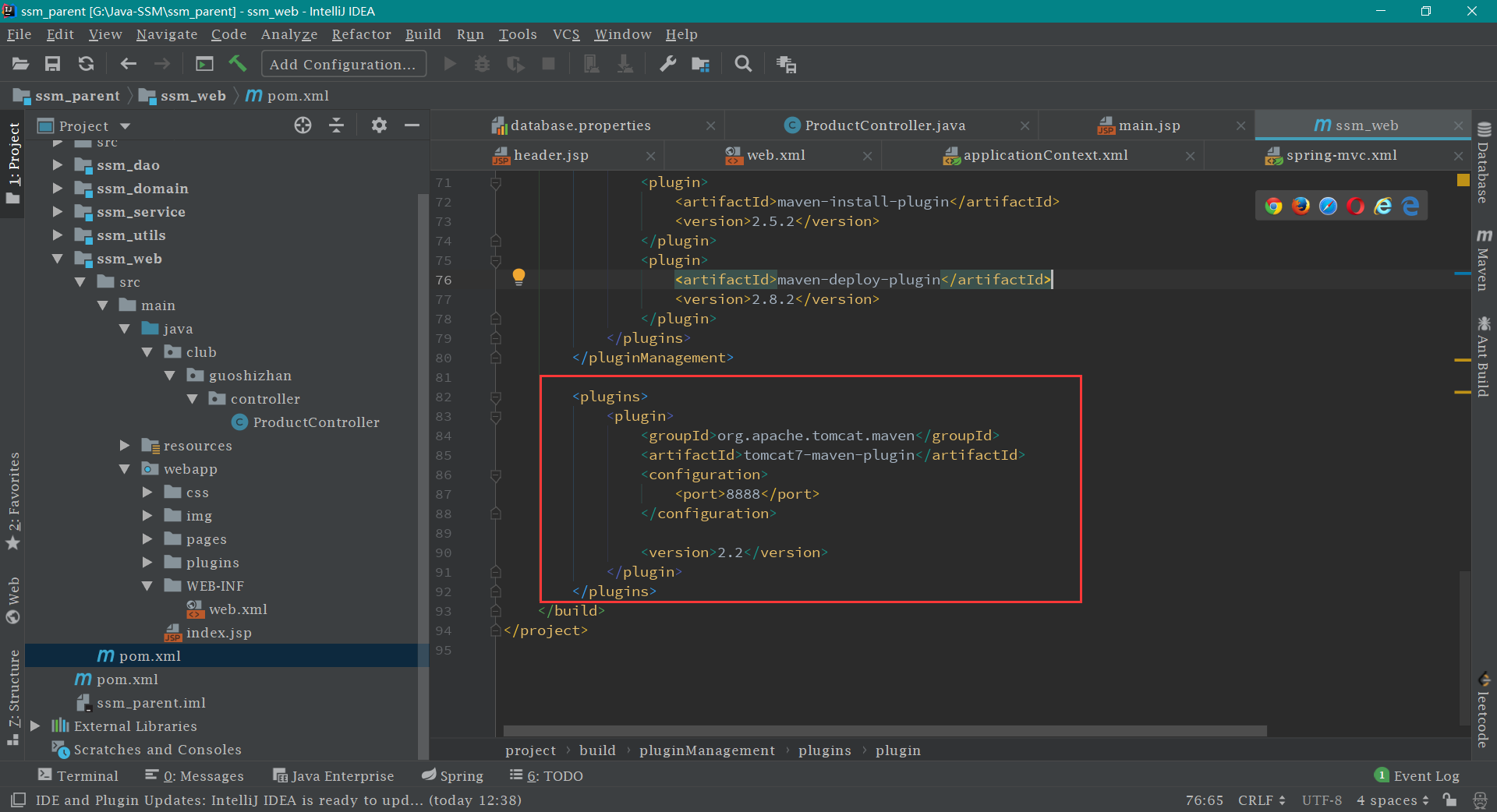 配置 tomcat 打开 ssm_web 模块 下的 pom 文件,加入下列代码,按如图所示放置并配置即可。如下: