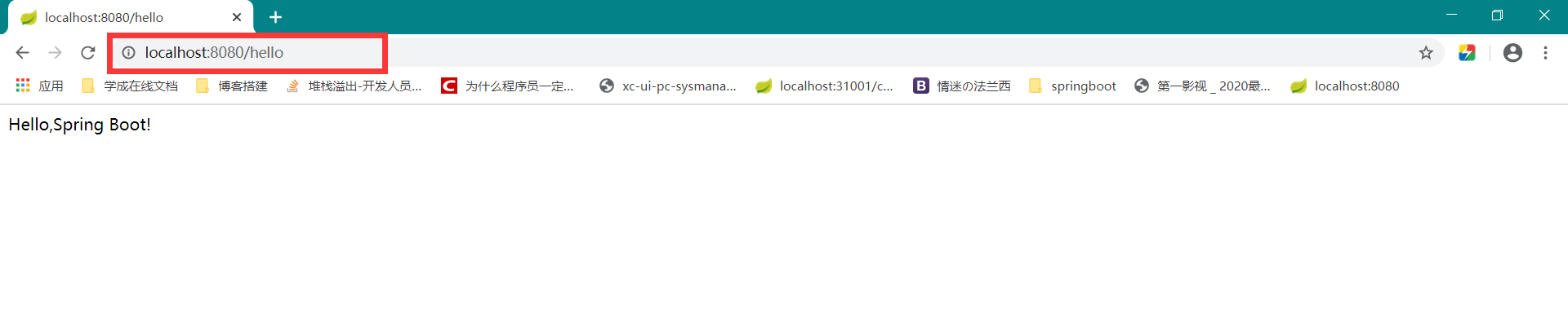 1 2 3 4 5 6 7 8 9 10 11 12 13 14 15 package edu.jgsu.Controller;import org.springframework.stereotype.Controller;import org.springframework.web.bind.annotation.RequestMapping;import org.springframework.web.bind.annotation.ResponseBody;@Controller public class HelloController { @ResponseBody @RequestMapping ("/hello" ) public String Hello () { return "Hello,Spring Boot!" ; } }