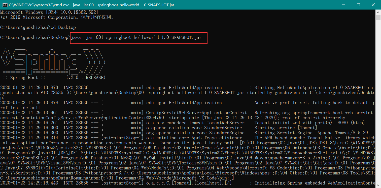 打包完成之后,停止 Maven 项目运行,去 Maven 工程目录下找到 target 文件夹,刚刚打包的 jar 包就放在里面 。然后复制到桌面,使用 java -jar xxx.jar 命令来使用 jar 包。这个 jar 包 内嵌 tomcat ,启动成功后仍然可以通过浏览器访问,如下图: