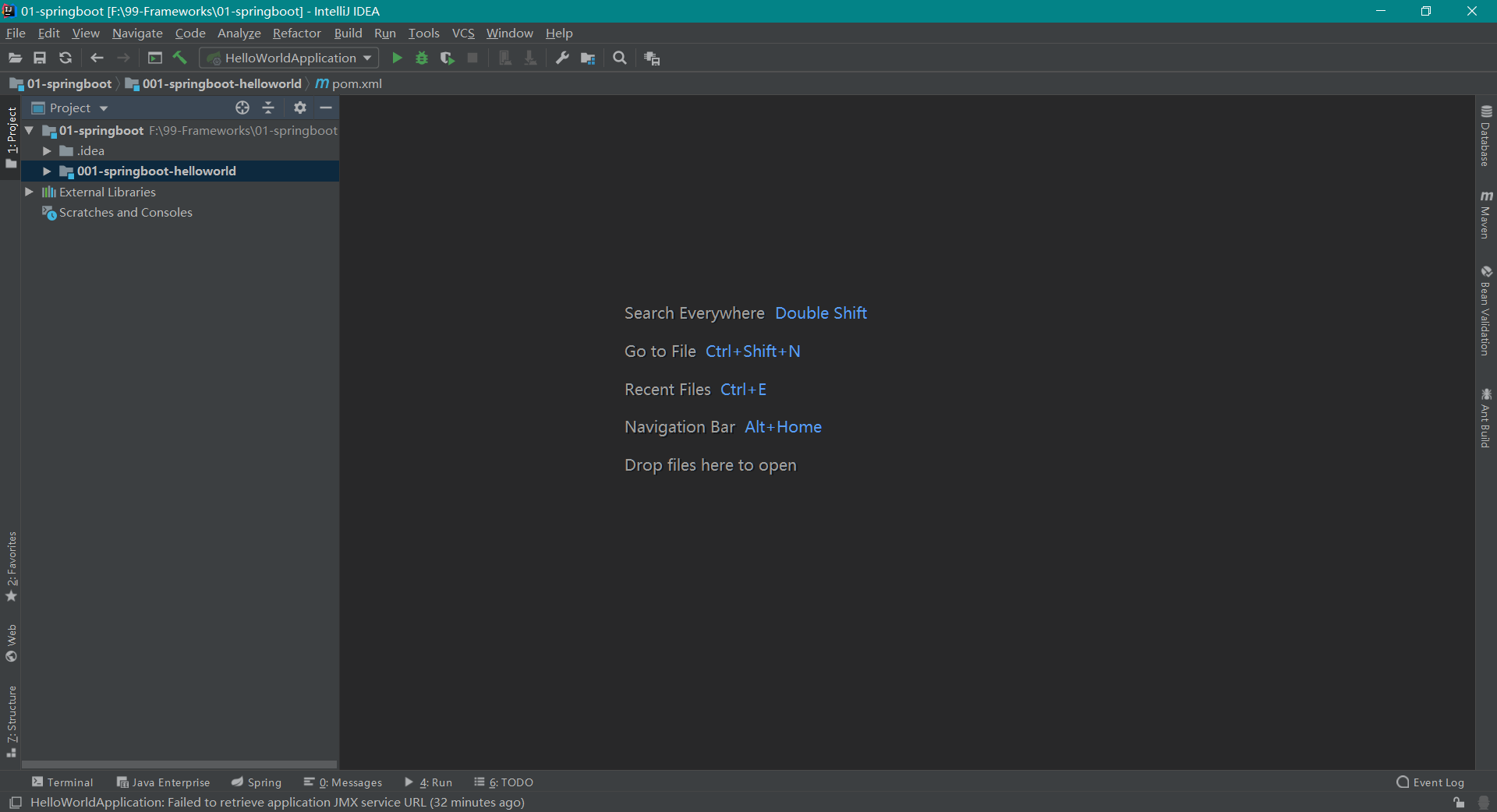 创建 Maven 项目 新建一个 project 或者 module ,选择 Maven ,然后填写相关信息,一直下一步即可 ,直到 Finish 就完成了 Maven 项目的创建。我创建的项目工程名是 001-springboot-helloworld,完成后如下图: