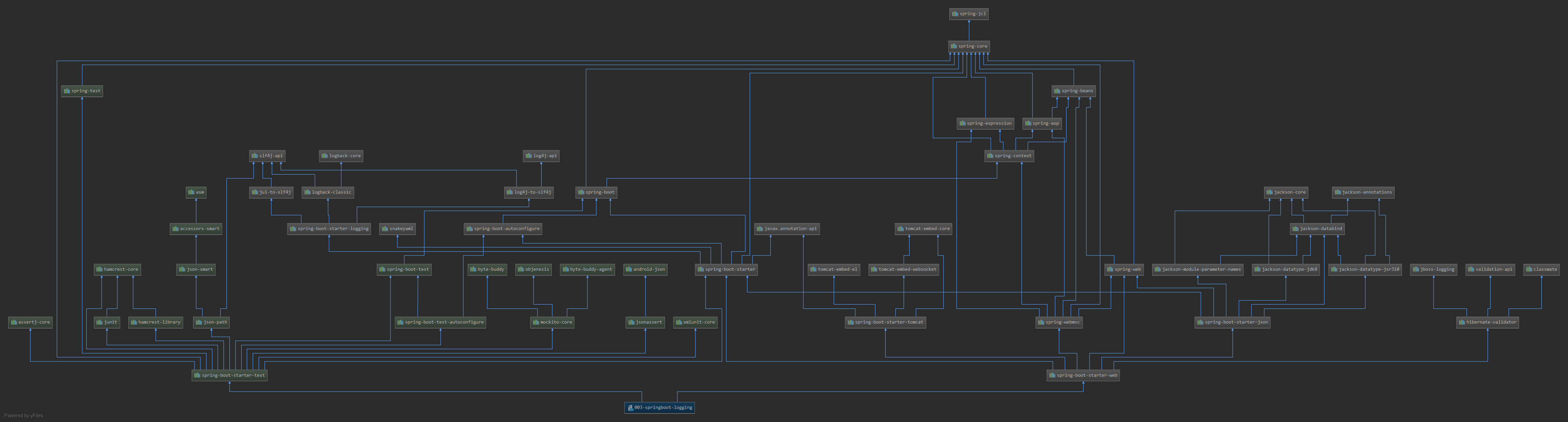 Spring Boot 日志关系 1 2 3 4 <dependency> <groupId>org.springframework.boot</groupId> <artifactId>spring-boot-starter</artifactId> </dependency>
