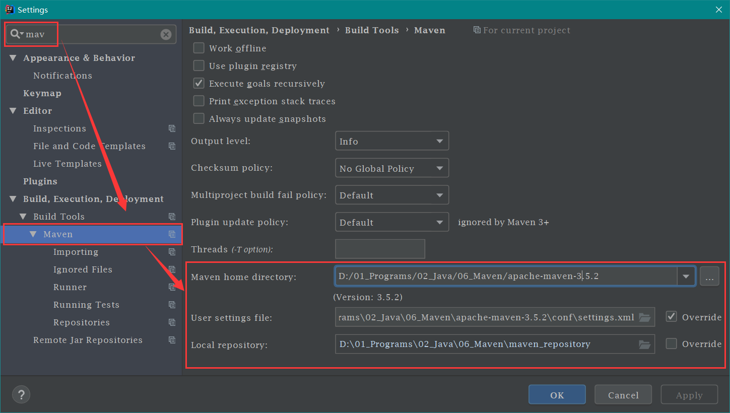 File\settings\build,Execution,Deployment\Build Tools\Maven 1 2 3 4 5 - Maven home directory - User settings file - Local repository