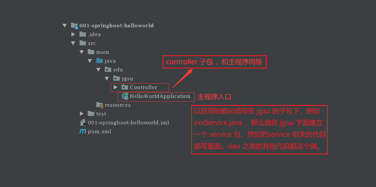 3、以后所有包和类必须放在 jgsu 包下面的子包里面,即 jgsu 下面的子包 和 HelloWorldApplication 同级