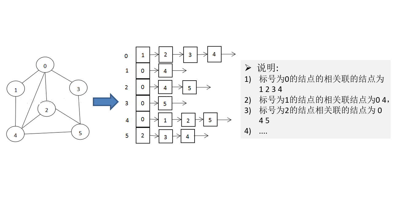 邻接表 邻接矩阵需要为每个顶点都分配 n 个边的空间,其实有很多边都是不存在,会造成空间的一定损失。邻接表的实现只关心存在的边,不关心不存在的边。因此没有空间浪费,邻接表由数组 + 链表组成,如下图: