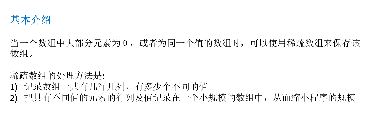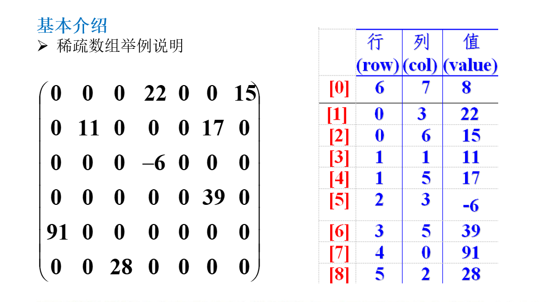 数组和广义表 稀疏数组 基本介绍 稀疏数组 可以看做是 普通数组的压缩 ,当一个数组中 大部分元素为 0 或者为同一个值 的数组时,可以使用稀疏数组来保存该数组。