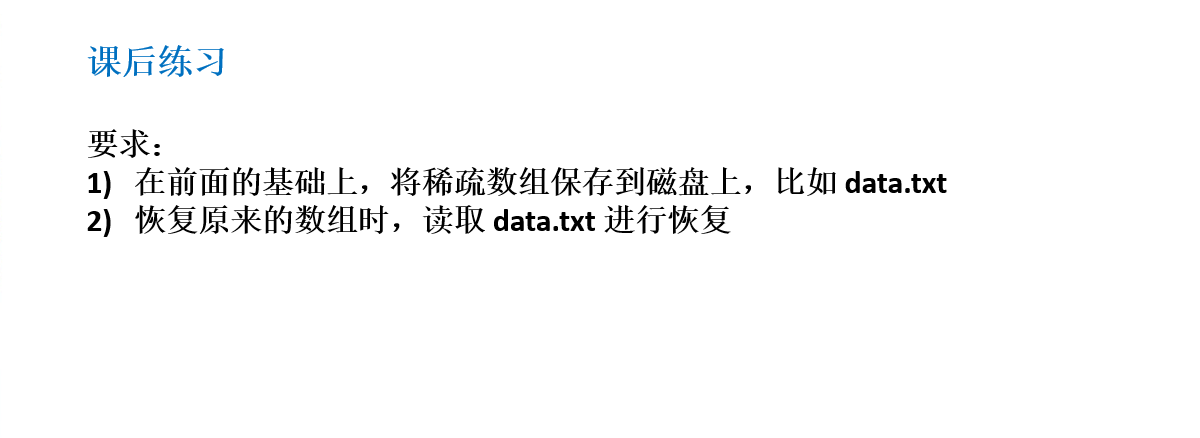 1 2 3 4 5 6 7 8 9 10 11 12 13 14 15 16 17 18 19 20 21 22 23 24 25 26 27 28 29 30 31 32 33 34 35 36 37 38 39 40 41 42 43 44 45 46 47 48 49 50 51 52 53 54 55 56 57 58 59 60 61 62 63 64 65 66 67 68 69 70 71 72 73 74 75 76 77 78 79 80 81 82 83 84 85 86 87 88 89 90 91 92 93 94 95 96 97 98 99 100 101 102 103 104 105 106 107 108 109 110 111 112 113 114 115 116 117 118 119 120 121 122 123 124 125 126 127 128 129 130 131 132 133 134 135 136 137 138 139 140 141 142 public class SparseArray { public static void main (String[] args) throws Exception { int chessArray[][] = new int [11 ][11 ]; chessArray[1 ][2 ] = 1 ; chessArray[2 ][3 ] = 2 ; chessArray[4 ][5 ] = 2 ; System.out.println("原始的二维数组:\n-----------------------------------------" ); for (int [] row : chessArray) { for (int data : row) { System.out.printf("%d\t" , data); } System.out.println(); } int sum = 0 ; for (int i = 0 ; i < chessArray.length; i++) { for (int j = 0 ; j < chessArray.length; j++) { if (chessArray[i][j] != 0 ) { sum++; } } } int sparseArr[][] = new int [sum + 1 ][3 ]; sparseArr[0 ][0 ] = chessArray.length; sparseArr[0 ][1 ] = chessArray[0 ].length; sparseArr[0 ][2 ] = sum; int count = 0 ; for (int i = 0 ; i < chessArray.length; i++) { for (int j = 0 ; j < chessArray.length; j++) { if (chessArray[i][j] != 0 ) { count++; sparseArr[count][0 ] = i; sparseArr[count][1 ] = j; sparseArr[count][2 ] = chessArray[i][j]; } } } System.out.println(); System.out.println("原始二维数组转为稀疏数组后:\n-----------------------------------------" ); for (int i = 0 ; i < sparseArr.length; i++) { System.out.printf("%d\t%d\t%d\t\n" , sparseArr[i][0 ], sparseArr[i][1 ], sparseArr[i][2 ]); } System.out.println(); int chessArr[][] = new int [sparseArr[0 ][0 ]][sparseArr[0 ][1 ]]; for (int i = 1 ; i < sparseArr.length; i++) { chessArr[sparseArr[i][0 ]][sparseArr[i][1 ]] = sparseArr[i][2 ]; } System.out.println("从稀疏数组恢复到原始二维数组:\n-----------------------------------------" ); for (int [] row : chessArr) { for (int data : row) { System.out.printf("%d\t" , data); } System.out.println(); } System.out.println(); File file = new File("data.txt" ); sparseToDisk(file, sparseArr); System.out.println("从磁盘读取稀疏数组并打印:\n-----------------------------------------" ); int [][] ints = diskToSparse(file, sparseArr); for (int [] anInt : ints) { for (int i : anInt) { System.out.printf("%d\t" , i); } System.out.println(); } } public static void sparseToDisk (File file, int [][] arr) throws IOException { if (!file.exists()) { file.createNewFile(); } FileWriter writer = new FileWriter(file); for (int i = 0 ; i < arr.length; i++) { for (int j = 0 ; j < 3 ; j++) { int num = arr[i][j]; Integer integer = new Integer(num); writer.write(integer.toString() + " " ); } writer.write("\r\n" ); } writer.flush(); writer.close(); } public static int [][] diskToSparse(File file, int [][] arr) throws Exception { BufferedReader reader = new BufferedReader(new FileReader(file)); int [][] sparseArray = new int [arr.length][3 ]; for (int i = 0 ; i < arr.length; i++) { String s = reader.readLine(); String[] split = s.split(" " ); int j = 0 ; for (String s1 : split) { sparseArray[i][j++] = Integer.valueOf(s1); } } reader.close(); return sparseArray; } }