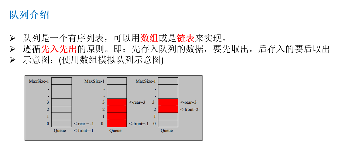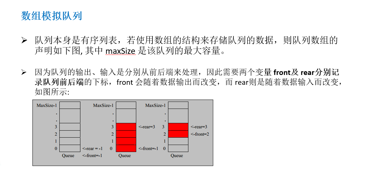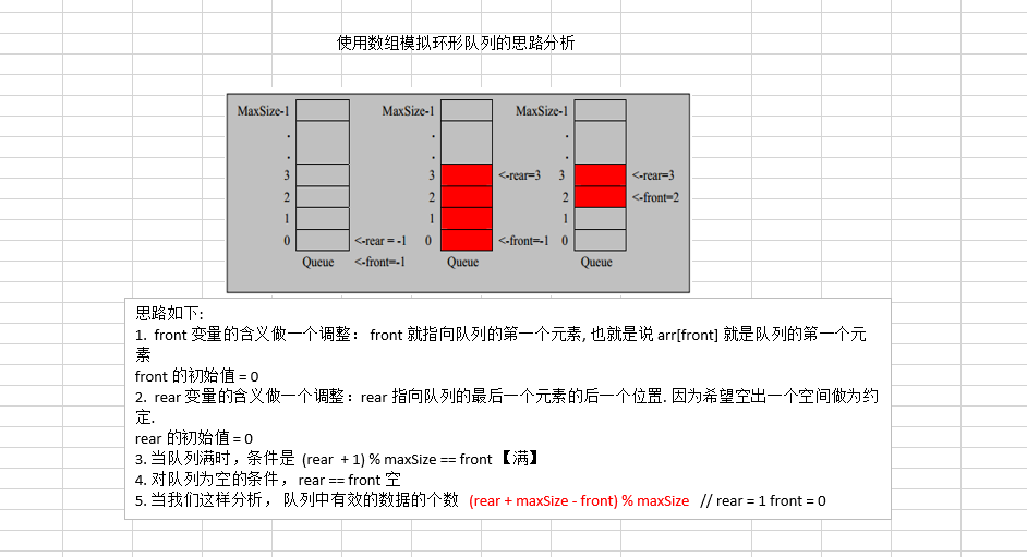 数组模拟队列 会出现一个小问题:数组不能够重复使用 。比如队列最大值为 3 ,添加 3 个数之后然后取出,再次添加就出现了队列满的情况。为了解决这个问题,就有了环形队列。接着往下看!!!