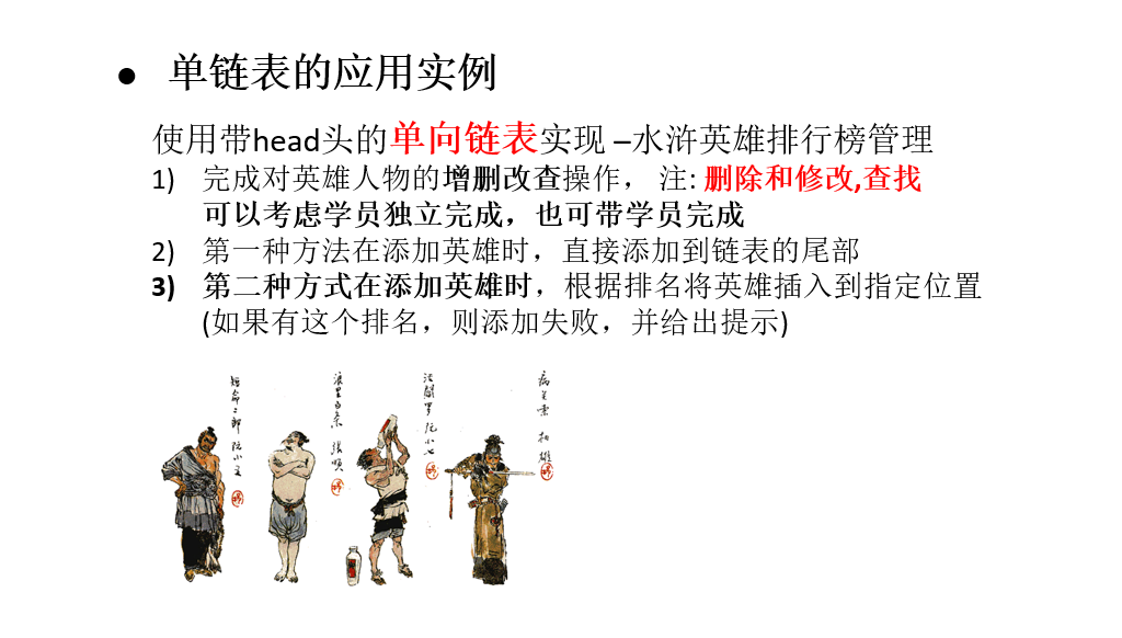 1 2 3 4 5 6 7 8 9 10 11 12 13 14 15 16 17 18 19 20 21 22 23 24 25 26 27 28 29 30 31 32 33 34 35 36 37 38 39 HeroNode heroNode = new HeroNode(2 ,"小卢" ,"玉麒麟~~~" ); singleLinkedList.update(heroNode); singleLinkedList.showList(); public void update (HeroNode heroNode) { if (head.next == null ) { System.out.println("链表为空!!!" ); return ; } HeroNode temp = head.next; boolean flag = false ; while (true ) { if (temp.next == null ) { break ; } if (temp.no == heroNode.no) { flag = true ; break ; } temp = temp.next; } if (flag) { temp.name = heroNode.name; temp.nickname = heroNode.nickname; } else { System.out.printf("没有找到编号为 %d 的节点,不能修改!!!" , heroNode.no); } }