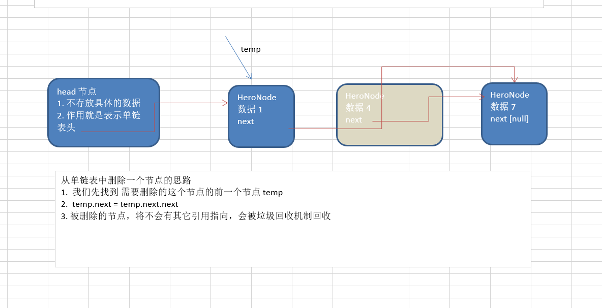 1 2 3 4 5 6 7 8 9 10 11 12 13 14 15 16 17 18 19 20 21 22 23 24 25 26 27 28 29 30 31 32 singleLinkedList.delete(1 ); singleLinkedList.delete(5 ); System.out.println("删除后链表的情况~~~~~" ); singleLinkedList.showList(); public void delete (int no) { HeroNode temp = head; boolean flag = false ; while (true ) { if (temp.next == null ) { break ; } if (temp.next.no == no) { flag = true ; break ; } temp = temp.next; } if (flag) { temp.next = temp.next.next; } else { System.out.printf("要删除的 %d 节点不存在\n" , no); } }