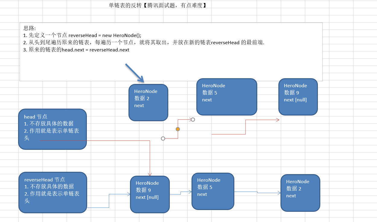 1 2 3 4 5 6 7 8 9 10 11 12 13 14 15 16 17 18 19 20 21 22 23 24 25 26 27 28 29 30 31 32 33 System.out.println("原来链表的情况~~~" ); singleLinkedList.showList(); System.out.println("反转后链表的情况~~~" ); SingleLinkedList.reverseList(head); singleLinkedList.showList(); public static void reverseList (HeroNode head) { if (head.next == null || head.next.next == null ) { return ; } HeroNode cur = head.next; HeroNode next = null ; HeroNode reverseHead = new HeroNode(0 , "" , "" ); while (cur != null ) { next = cur.next; cur.next = reverseHead.next; reverseHead.next = cur; cur = next; } head.next = reverseHead.next; }