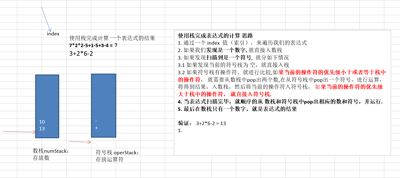 1 2 3 4 5 6 7 8 9 10 11 12 13 14 15 16 17 18 19 20 21 22 23 24 25 26 27 28 29 30 31 32 33 34 35 36 37 38 39 40 41 42 43 44 45 46 47 48 49 50 51 52 53 54 55 56 57 58 59 60 61 62 63 64 65 66 67 68 69 70 71 72 73 74 75 76 77 78 79 80 81 82 83 84 85 86 87 88 89 90 91 92 93 94 95 96 97 98 99 100 101 102 103 104 105 106 107 108 109 110 111 112 113 114 115 116 117 118 119 120 121 122 123 124 125 126 127 128 129 130 131 132 133 134 135 136 137 138 139 140 141 142 143 144 145 146 147 148 149 150 151 152 153 154 155 156 157 158 159 160 161 162 163 164 165 166 167 168 169 170 171 172 173 174 175 176 177 178 179 180 181 182 183 184 185 186 public class Calculator { public static void main (String[] args) { String expression = "30+50*6-2" ; ArrayStack numStack = new ArrayStack(10 ); ArrayStack operStack = new ArrayStack(10 ); int index = 0 ; int num1; int num2; int oper; int res = 0 ; char ch; String keepNum = "" ; while (true ) { ch = expression.substring(index, index + 1 ).charAt(0 ); if (operStack.isOper(ch)) { if (!operStack.isEmpty()) { if (operStack.priority(ch) <= operStack.priority(operStack.peek())) { num1 = numStack.pop(); num2 = numStack.pop(); oper = operStack.pop(); res = numStack.cal(num1, num2, oper); numStack.push(res); operStack.push(ch); } else { operStack.push(ch); } } else { operStack.push(ch); } } else { keepNum += ch; if (index == expression.length() - 1 ) { numStack.push(Integer.parseInt(keepNum)); } else { if (operStack.isOper(expression.substring(index + 1 , index + 2 ).charAt(0 ))) { numStack.push(Integer.parseInt(keepNum)); keepNum = "" ; } } } index++; if (index >= expression.length()) { break ; } } while (true ) { if (operStack.isEmpty()) { break ; } else { num1 = numStack.pop(); num2 = numStack.pop(); oper = operStack.pop(); res = numStack.cal(num1, num2, oper); numStack.push(res); } } System.out.println("表达式最终结果:" + res); } } class ArrayStack { private int maxSize; private int [] stack; private int top = -1 ; public ArrayStack (int maxSize) { this .maxSize = maxSize; stack = new int [maxSize]; } public boolean isFull () { return top == maxSize - 1 ; } public boolean isEmpty () { return top == -1 ; } public void push (int value) { if (isFull()) { System.out.println("栈满!!!" ); return ; } top++; stack[top] = value; } public int pop () { if (isEmpty()) { throw new RuntimeException("栈空,没有数据!!!" ); } int value = stack[top]; top--; return value; } public void showStack () { if (isEmpty()) { System.out.println("栈空,没有数据!!!" ); return ; } for (int i = top; i >= 0 ; i--) { System.out.printf("stack[%d] = %d\n" , i, stack[i]); } } public int priority (int oper) { if (oper == '*' || oper == '/' ) { return 1 ; } else if (oper == '+' || oper == '-' ) { return 0 ; } else { return -1 ; } } public boolean isOper (char val) { return val == '+' || val == '-' || val == '*' || val == '/' ; } public int cal (int num1, int num2, int oper) { int res = 0 ; switch (oper) { case '+' : res = num1 + num2; break ; case '-' : res = num2 - num1; break ; case '*' : res = num2 * num1; break ; case '/' : res = num2 / num1; break ; default : break ; } return res; } public int peek () { return stack[top]; } }
