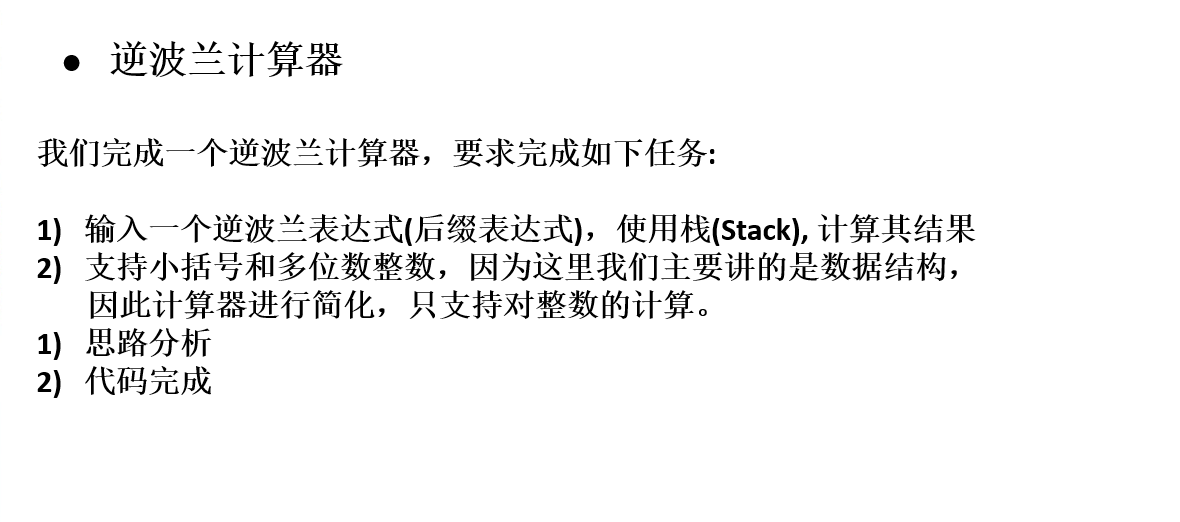 1 2 3 4 5 6 7 8 9 10 11 12 13 14 15 16 17 18 19 20 21 22 23 24 25 26 27 28 29 30 31 32 33 34 35 36 37 38 39 40 41 42 43 44 45 46 47 48 49 50 51 52 53 54 55 56 57 58 59 60 61 62 63 64 65 66 67 68 69 70 71 72 73 public class PolandNotation { public static void main (String[] args) { String suffixExpression = "3 4 + 5 * 6 -" ; List<String> list = getListstring(suffixExpression); System.out.println(list); int res = calculate(list); System.out.println("逆波兰表达式最终结果:" + res); System.out.println(); String suffixExp = "4 5 * 8 - 60 + 8 2 / +" ; List<String> stringList = getListstring(suffixExp); System.out.println(stringList); int calculate = calculate(stringList); System.out.println("逆波兰表达式最终结果:" + calculate); } public static List<String> getListstring (String suffixExpression) { String[] strings = suffixExpression.split(" " ); List<String> list = new ArrayList<>(); for (String string : strings) { list.add(string); } return list; } public static int calculate (List<String> ls) { Stack<String> strings = new Stack<>(); for (String item : ls) { if (item.matches("\\d+" )) { strings.push(item); } else { int num2 = Integer.parseInt(strings.pop()); int num1 = Integer.parseInt(strings.pop()); int res = 0 ; if (item.equals("+" )) { res = num1 + num2; } else if (item.equals("-" )) { res = num1 - num2; } else if (item.equals("*" )) { res = num1 * num2; } else if (item.equals("/" )) { res = num1 / num2; } else { throw new RuntimeException("运算符有误!!!" ); } strings.push(res + "" ); } } return Integer.parseInt(strings.pop()); } }